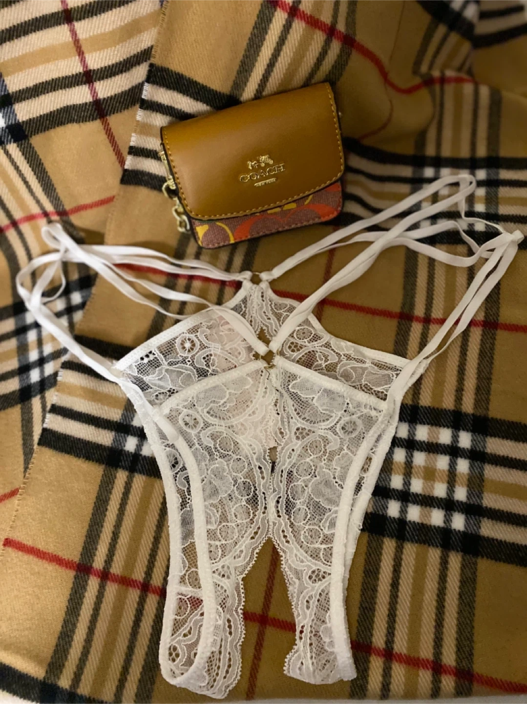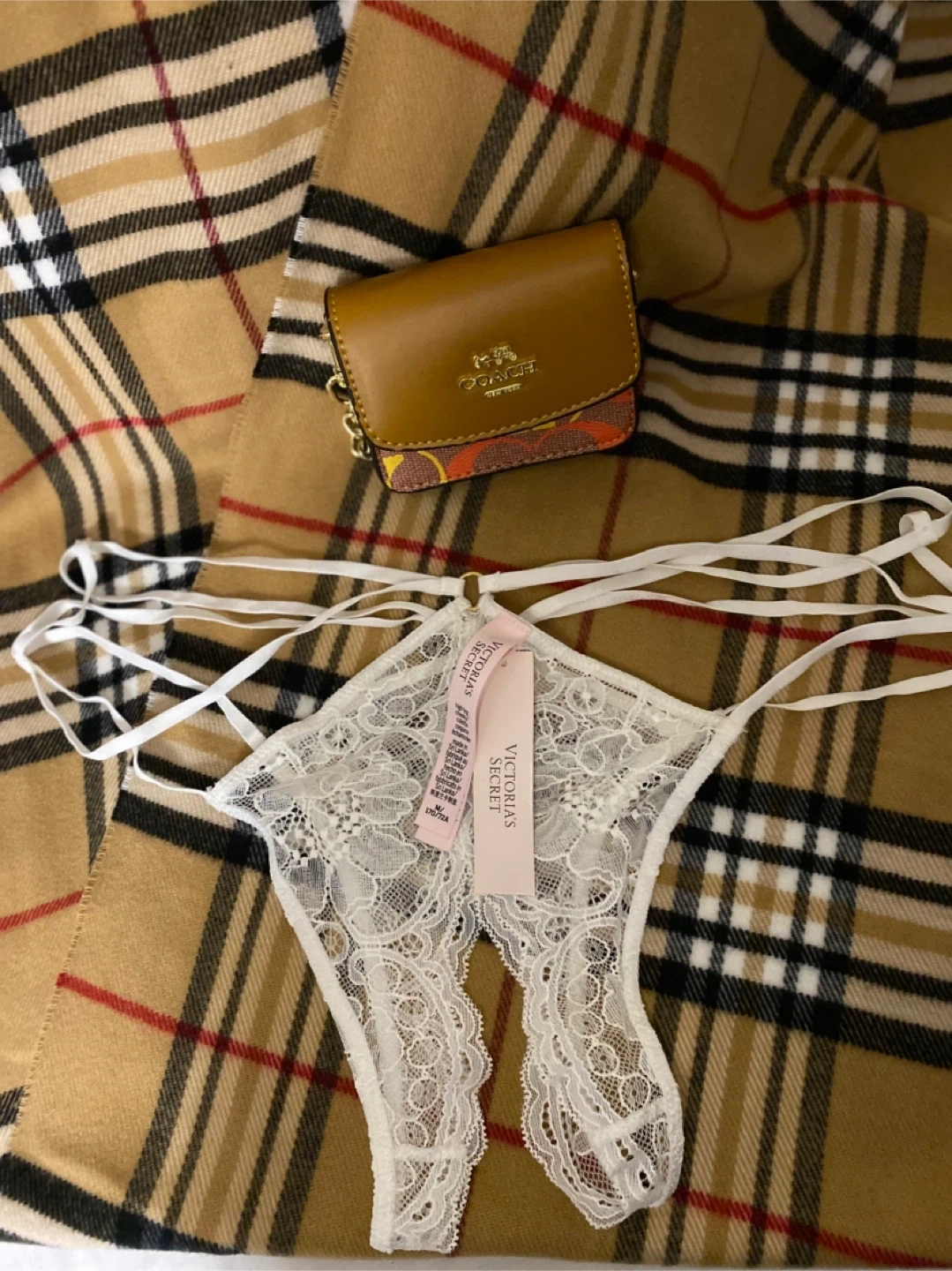 Victoria's Secret white lace thong panty. Delicate floral lace design with strappy detailing. Size is small.