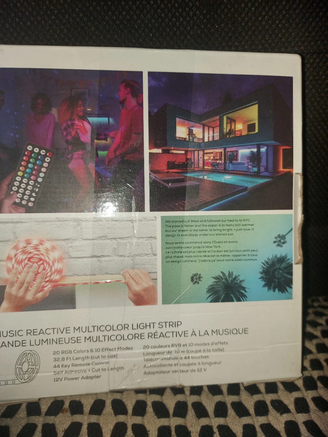 This music reactive multicolor light strip comes with 20 RGB colors and 10 effect modes. It's 32.8 ft long and can be cut to size. It includes a 44-key remote control and a 12V power adapter. The strip is self-adhesive and cut to length.