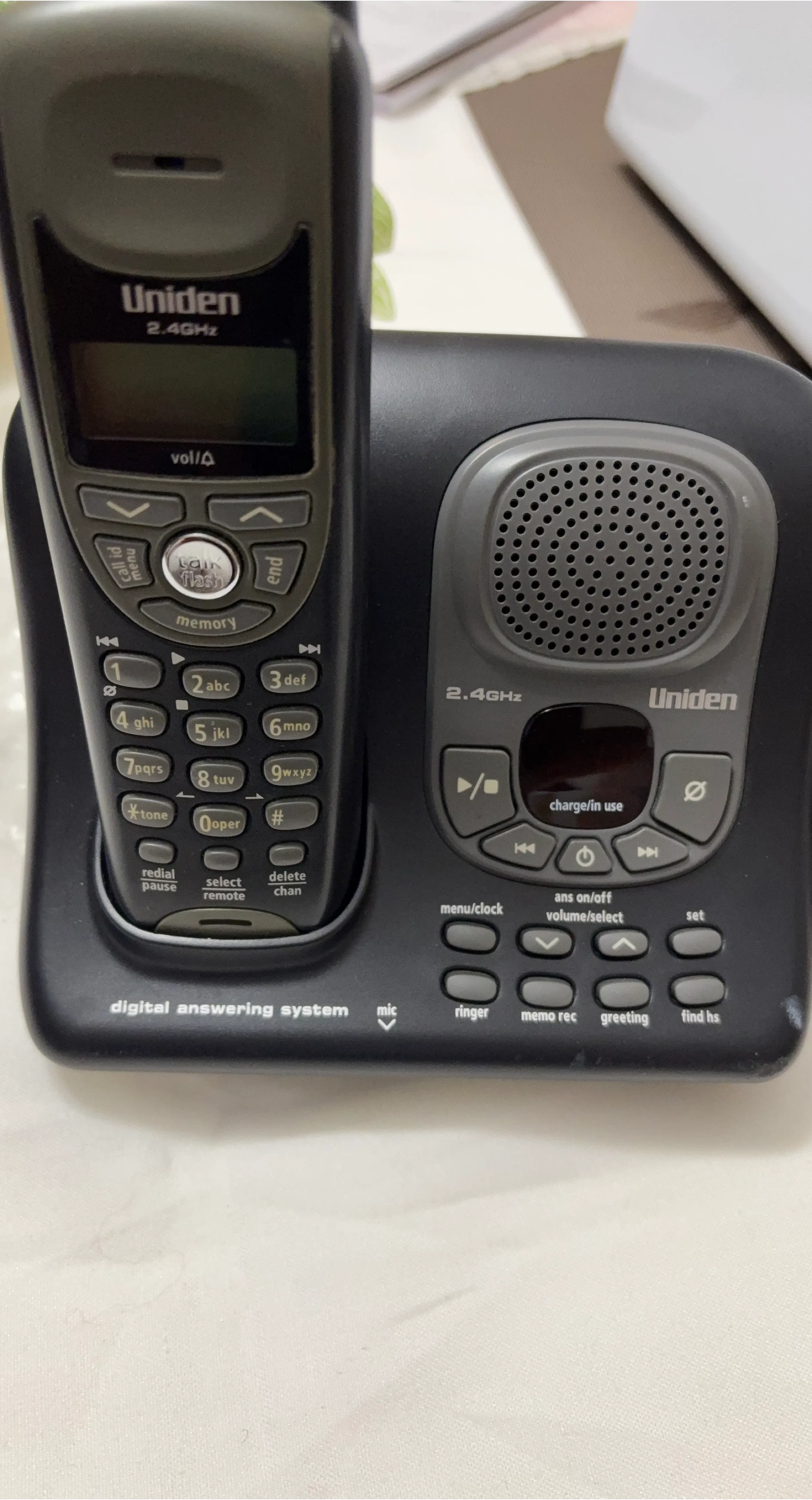 This is a Uniden 2.4GHz cordless phone with a digital answering system. It features a handset and base unit with a full keypad and speakerphone capabilities. The answering system allows for memo recording and custom greetings.