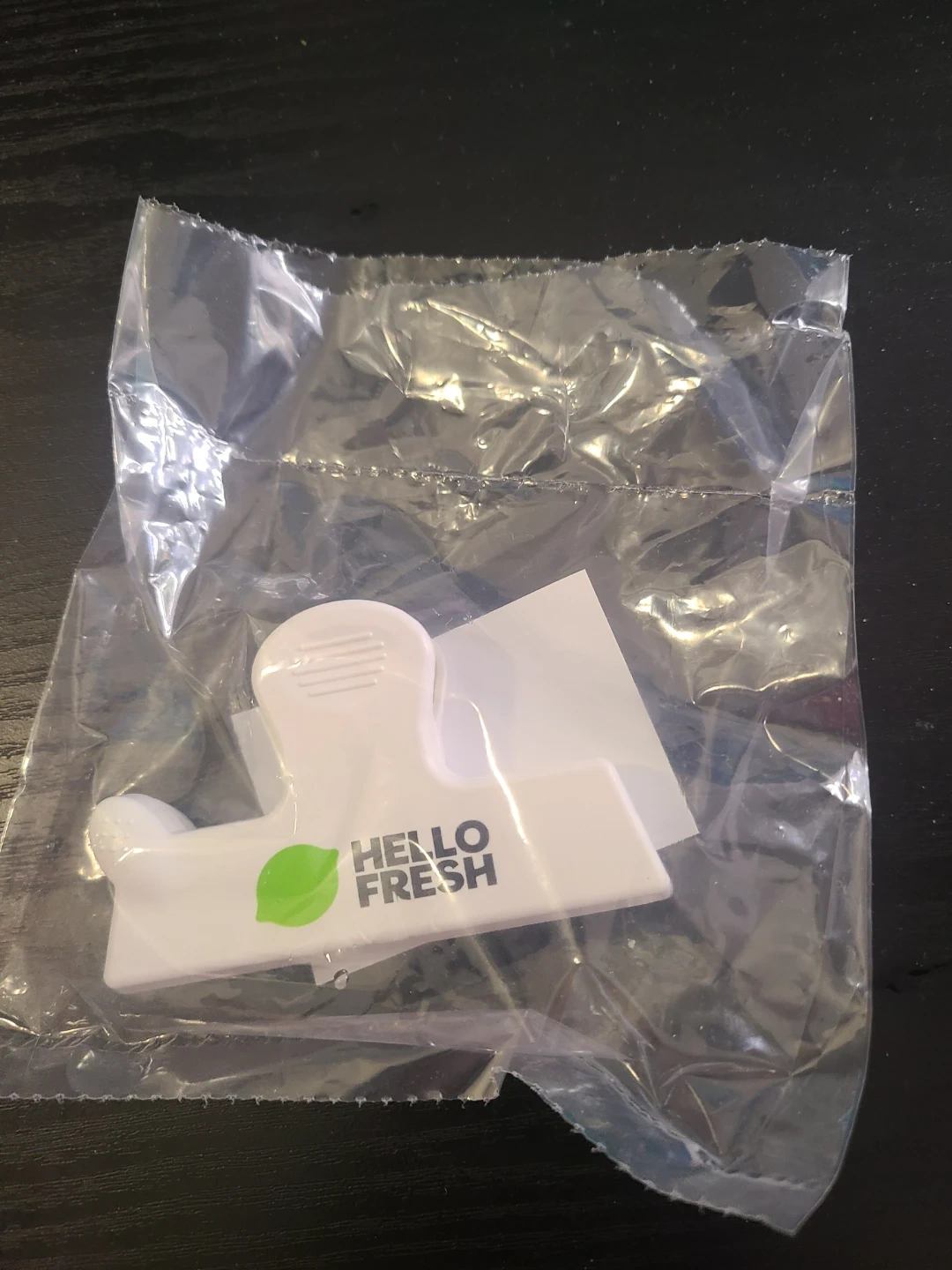This is a white bag clip from Hello Fresh. It's useful for keeping bags sealed. It's made of plastic with magnet behind