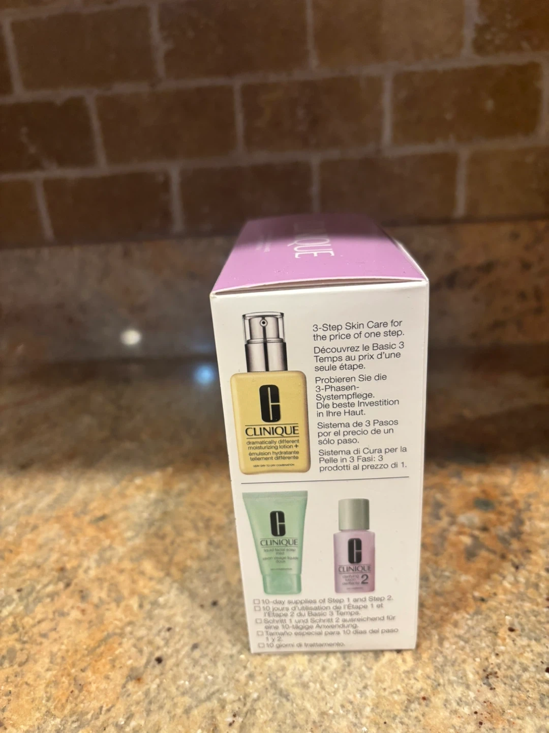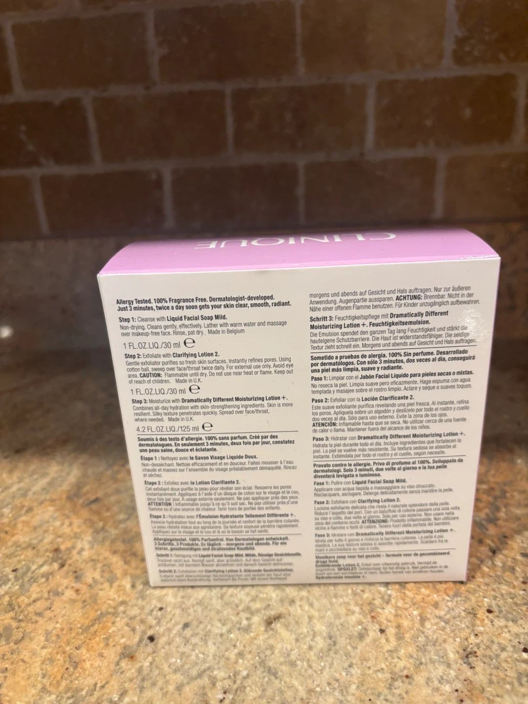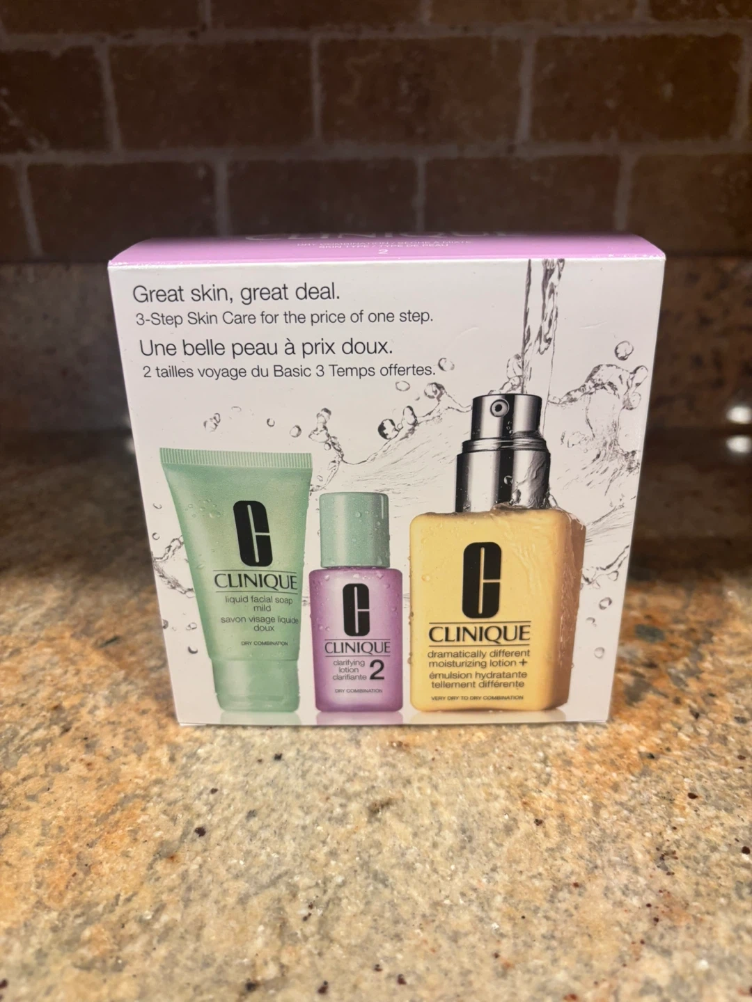 This 3-Step Skin Care set includes Clinique Liquid Facial Soap, Clarifying Lotion 2, and Dramatically Different Moisturizing Lotion. It's designed for oily T-zone skin. Great for a basic 3-step routine!