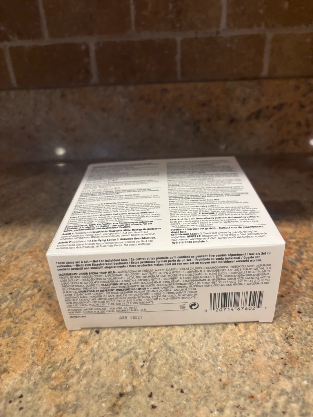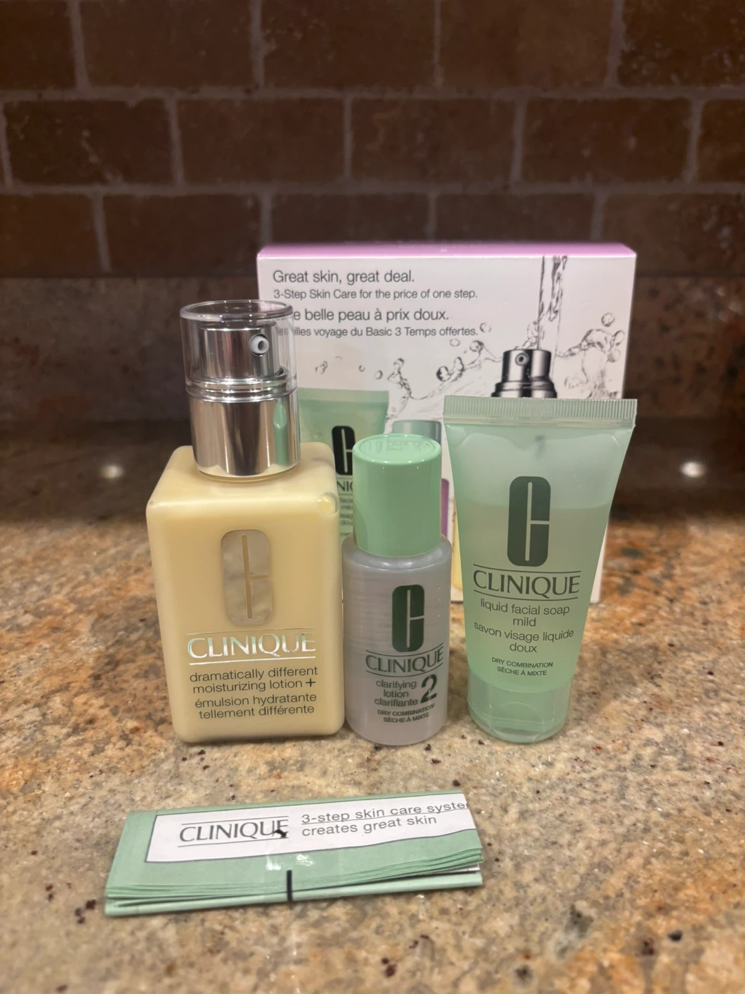 This 3-Step Skin Care set includes Clinique Liquid Facial Soap, Clarifying Lotion 2, and Dramatically Different Moisturizing Lotion. It's designed for oily T-zone skin. Great for a basic 3-step routine!