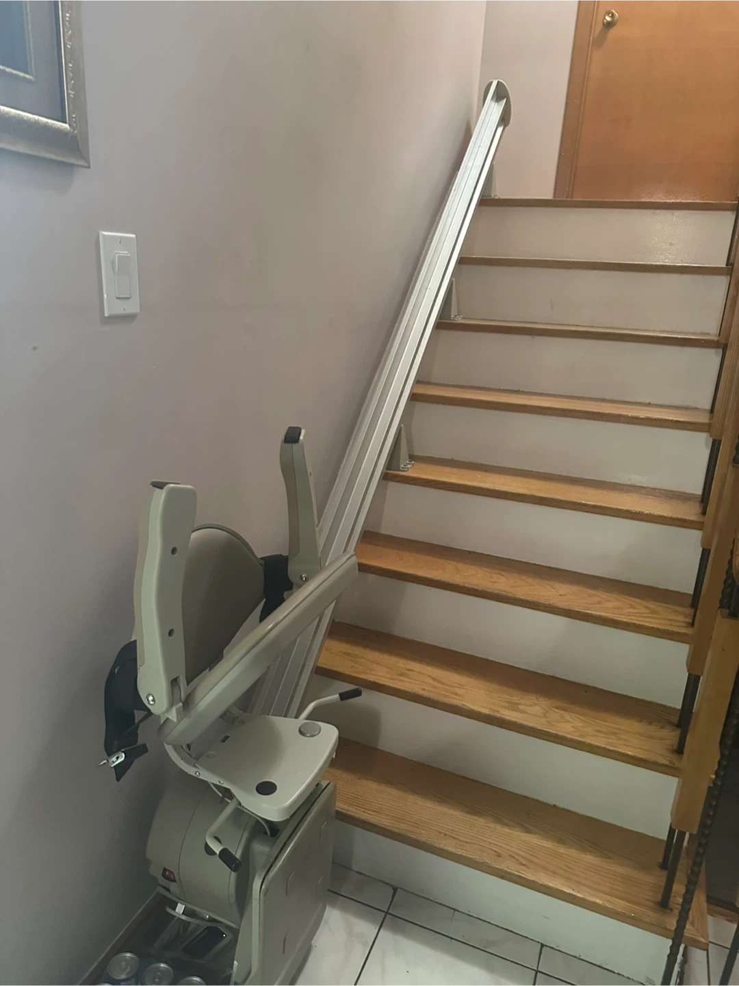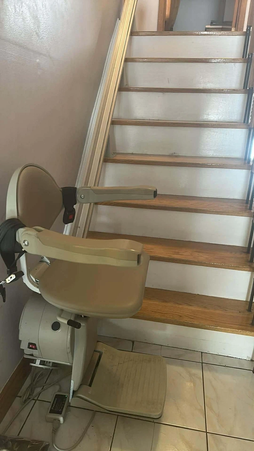 This is a used stair lift chair. It's a beige and white unit designed to assist with mobility on stairs. The chair folds up when not in use. It's ideal for individuals who have difficulty navigating staircases.
