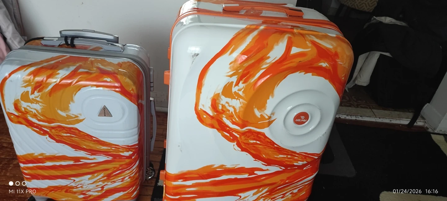 This is a set of two Delwin suitcases. The luggage features a white base with a vibrant orange swirl design. It's perfect for travellers who want to stand out!