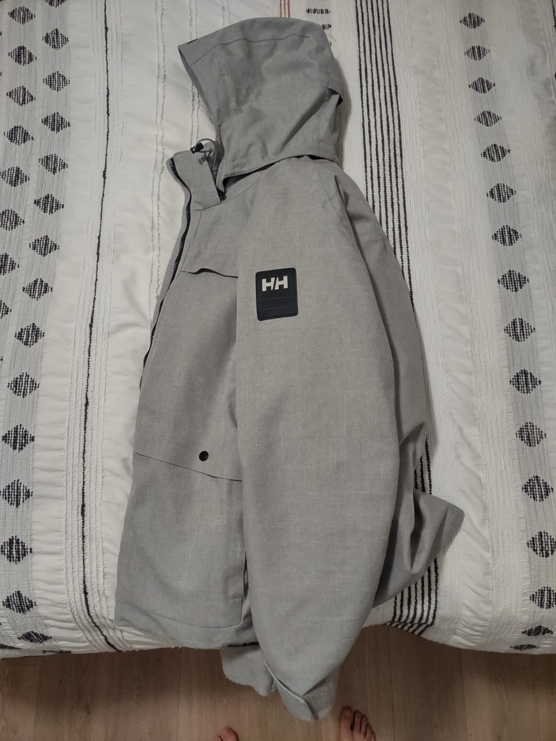 Helly Hansen men's insulated jacket in a light grey colour. It's a ski jacket with HH-Flow technology. This jacket is designed for cold weather activities.