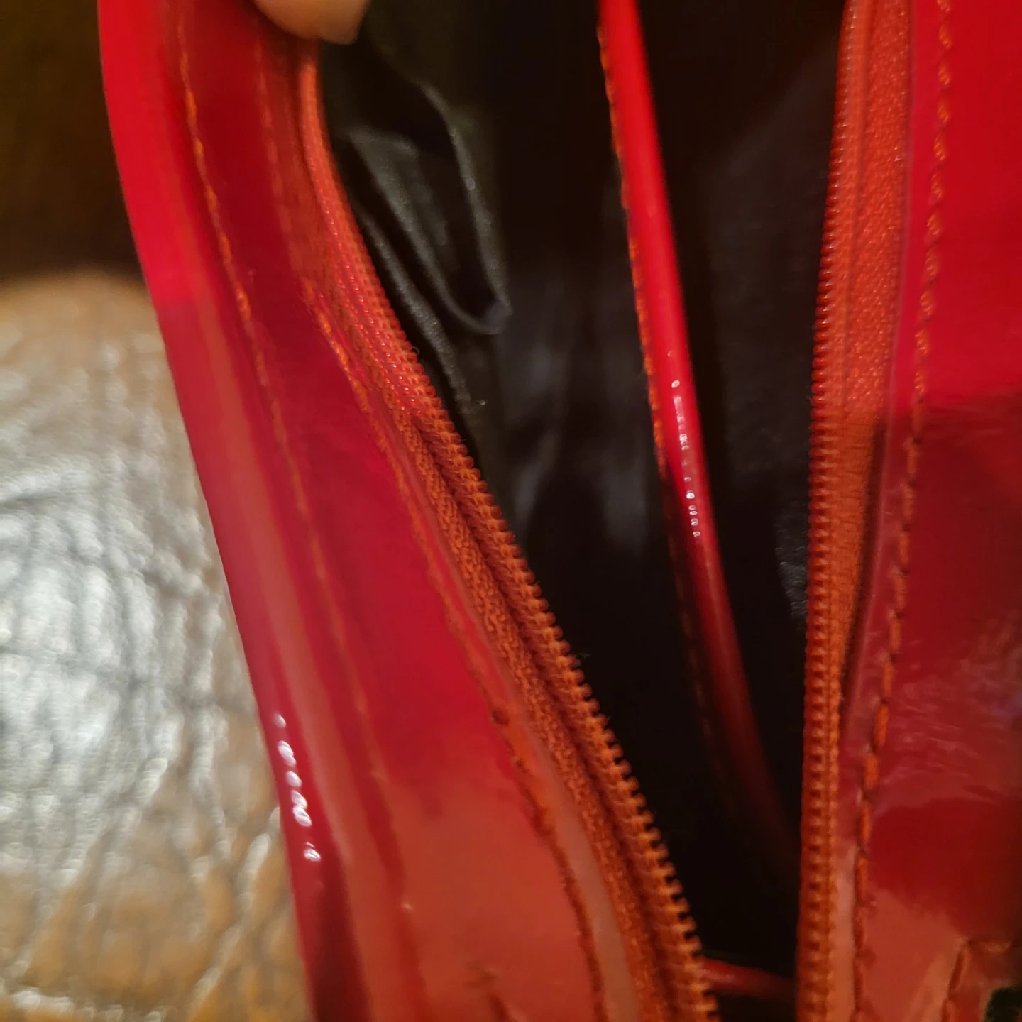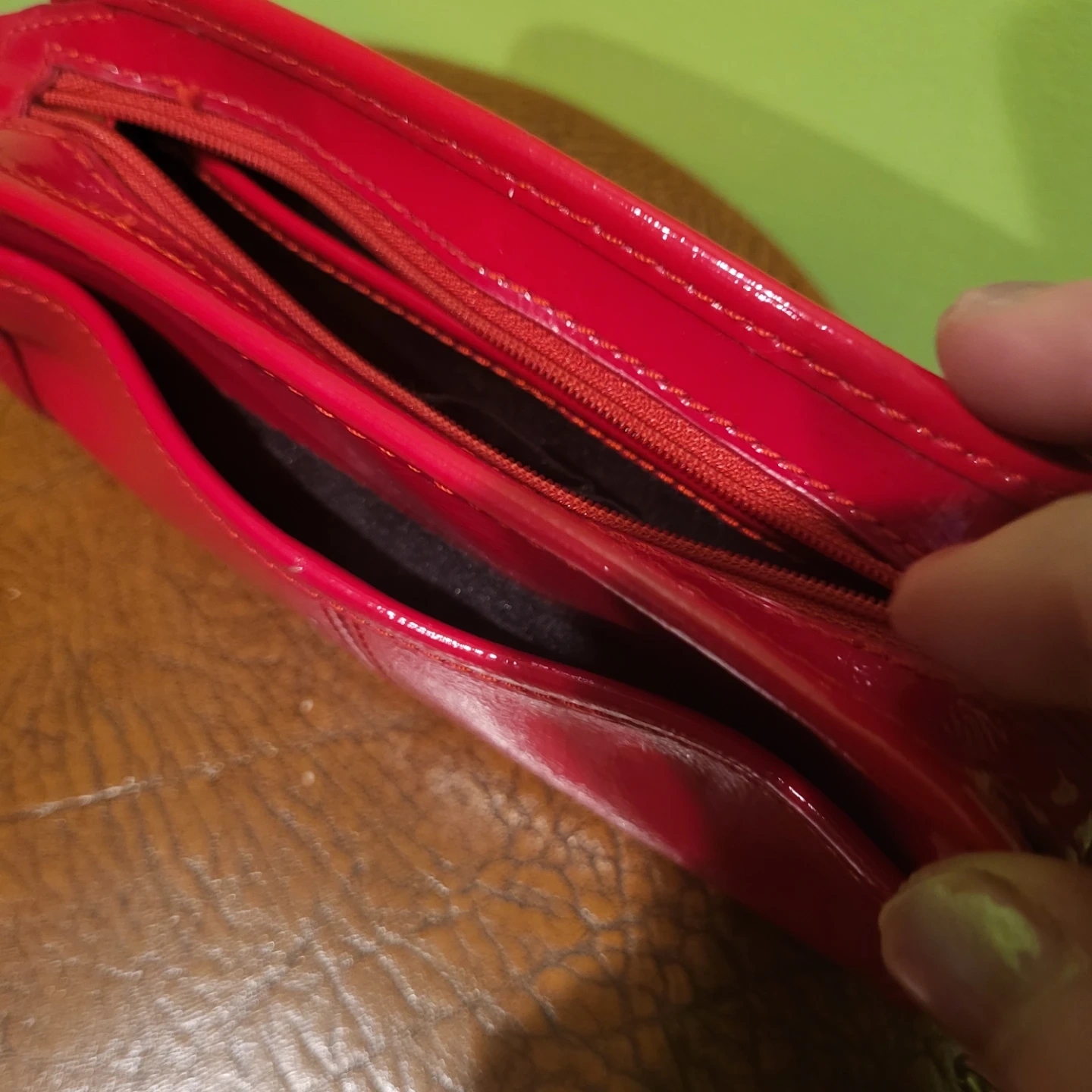 A bright red patent clutch wallet from Nine West. It has a wrist strap and a rectangular window on the front. Inside, it features multiple card slots and zippered compartments.