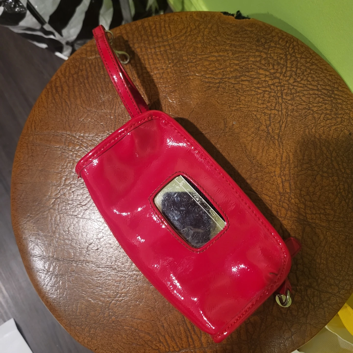 A bright red patent clutch wallet from Nine West. It has a wrist strap and a rectangular window on the front. Inside, it features multiple card slots and zippered compartments.