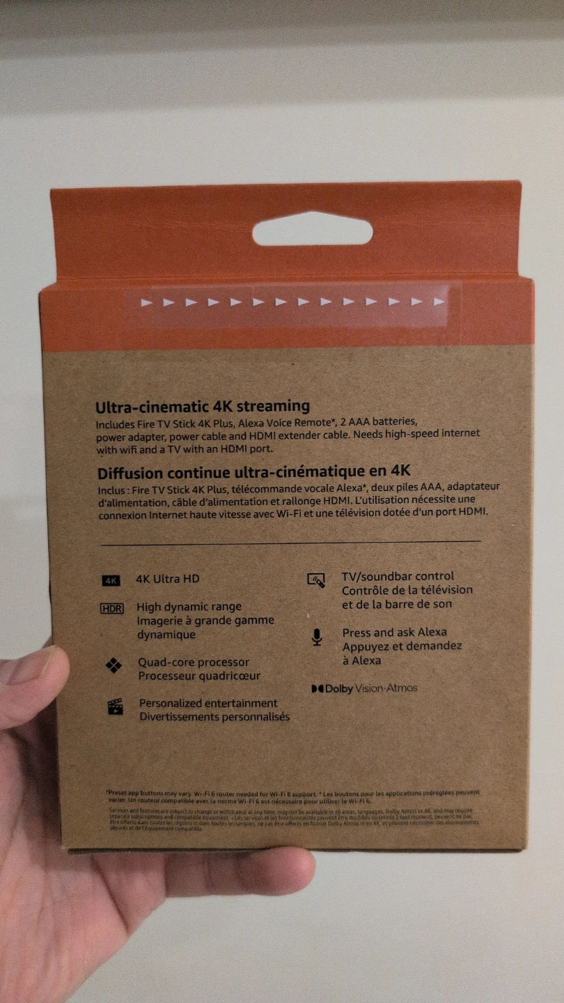 It comes with a Fire TV Stick 4K Plus, Alexa Voice Remote, 2 AAA batteries, a power adapter, cable, and HDMI extender.
