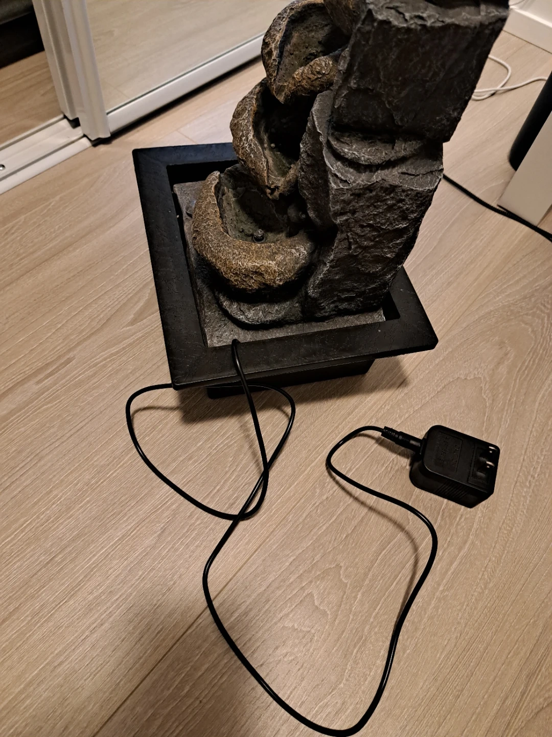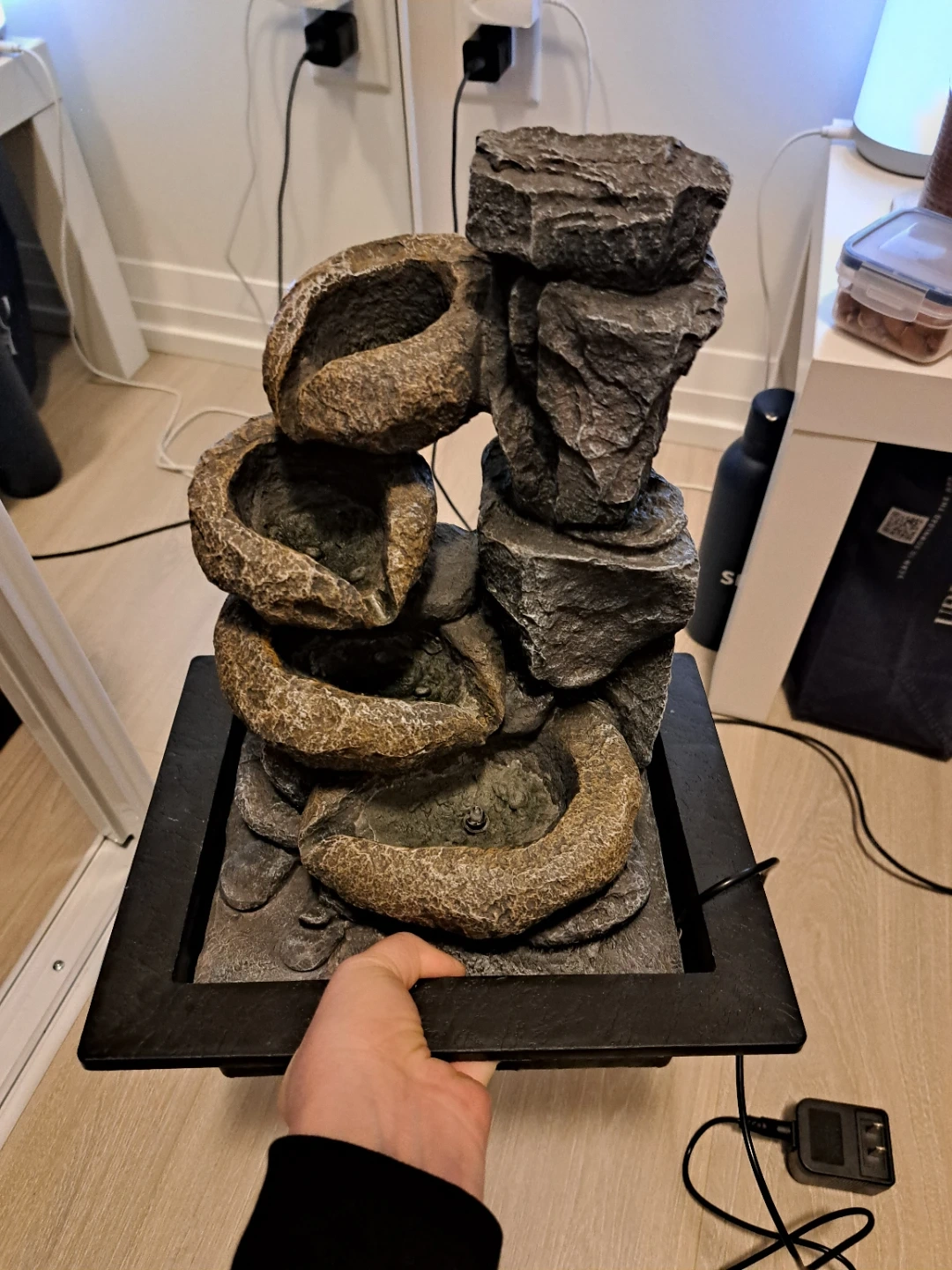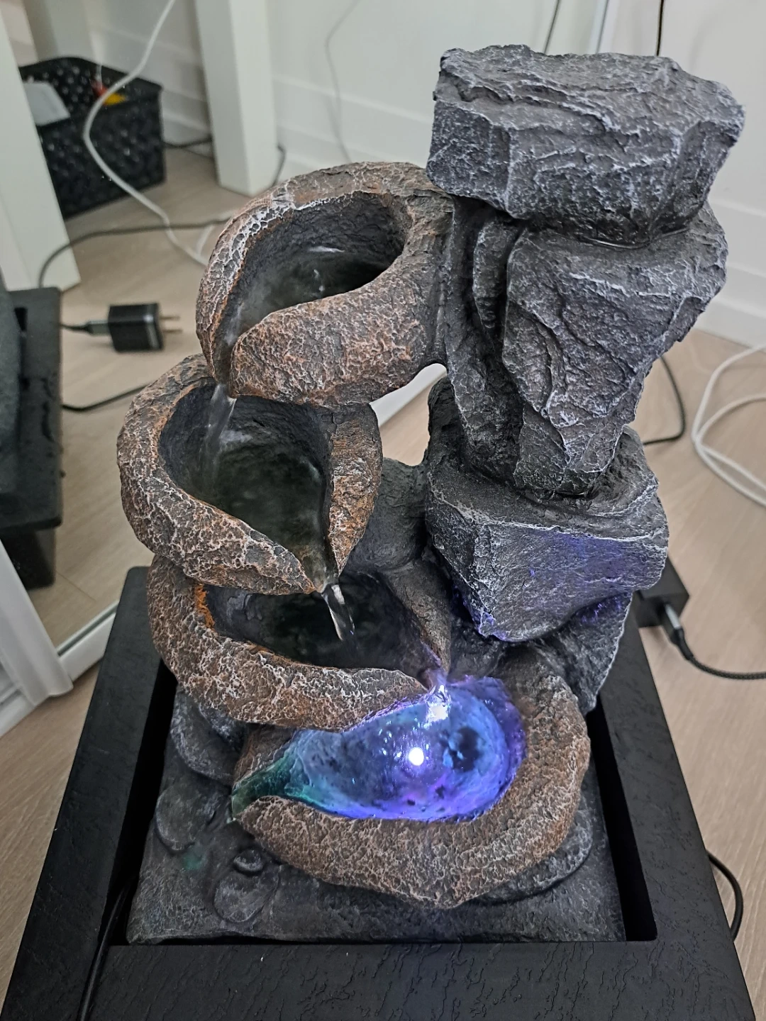 This tabletop water fountain features a multi-tiered rock design with a soothing water flow. It includes gentle LED lighting for ambiance. It's a great addition to any desk or living space for a touch of zen.