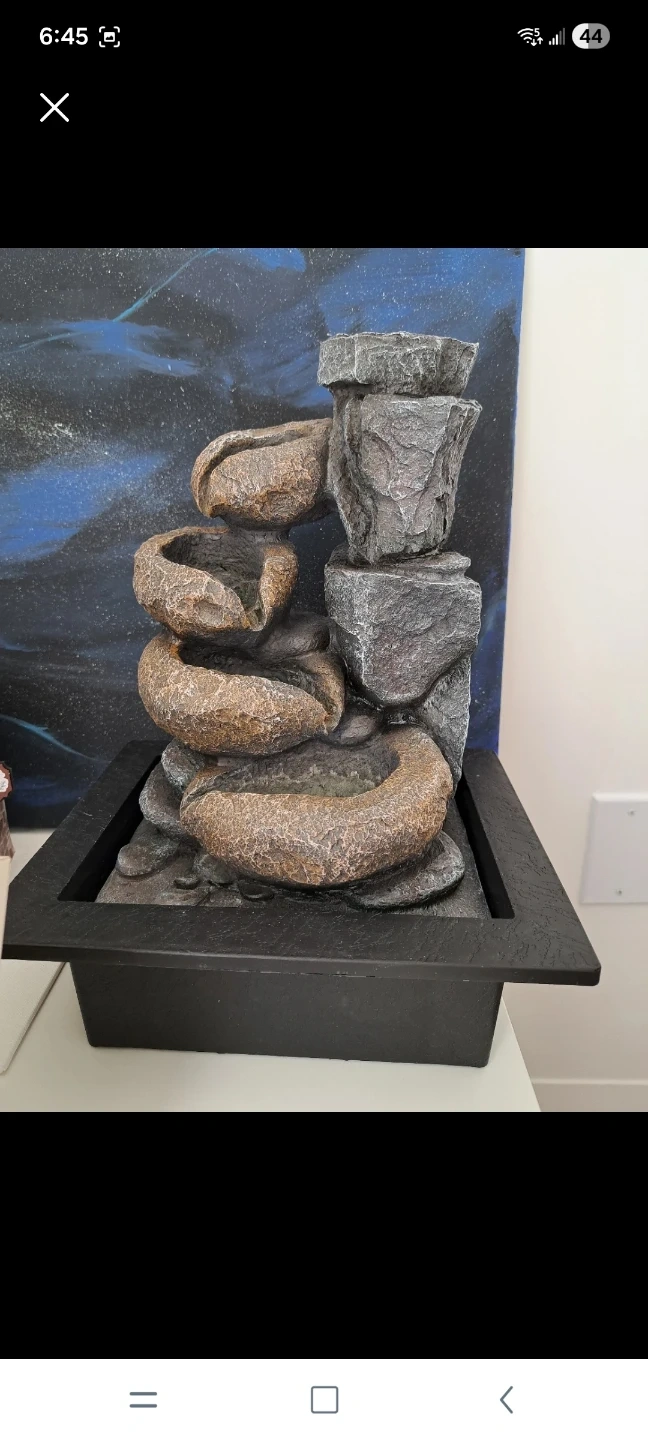 This tabletop water fountain features a multi-tiered rock design with a soothing water flow. It includes gentle LED lighting for ambiance. It's a great addition to any desk or living space for a touch of zen.
