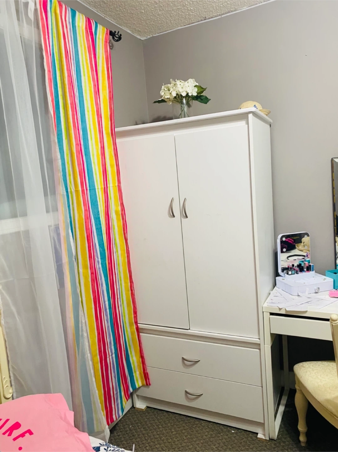 A white wardrobe with two doors and two drawers at the bottom. It's a versatile storage solution for any bedroom. This unit provides ample space for clothing and accessories.