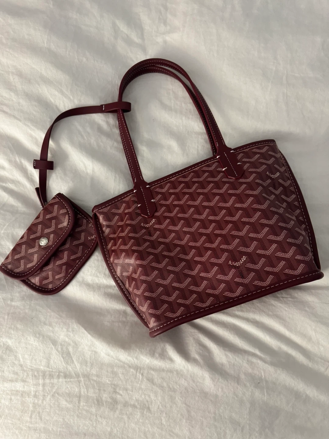 Tote bag in burgundy (small). It's made of coated canvas with leather trim. Comes with a matching pouch. Includes dust bag.