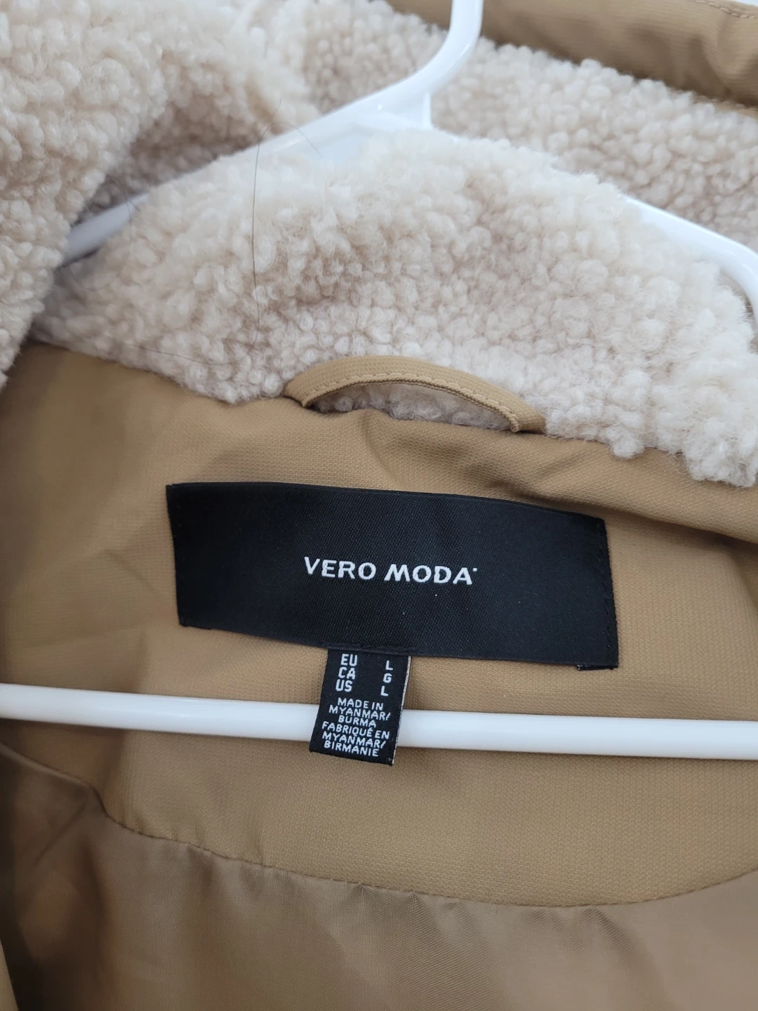 This is a VERO MODA quilted vest with a sherpa lining and hood. It's a camel colour and features a zip and snap closure with pockets. Size is large.