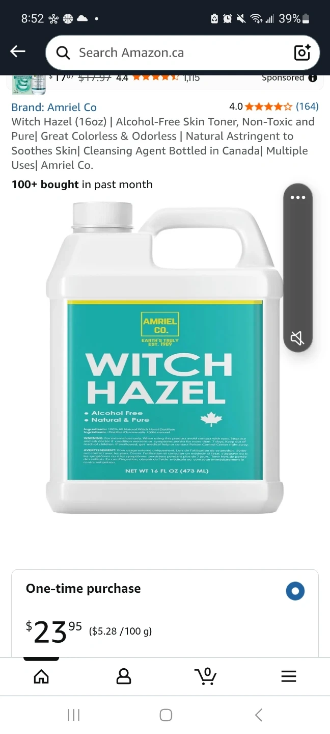 This is Amriel Co. Witch Hazel, bottled in Canada. It's alcohol-free, natural, and pure. The bottle is 16 fluid ounces (473 ml). Best before Jan 10, 2027.
