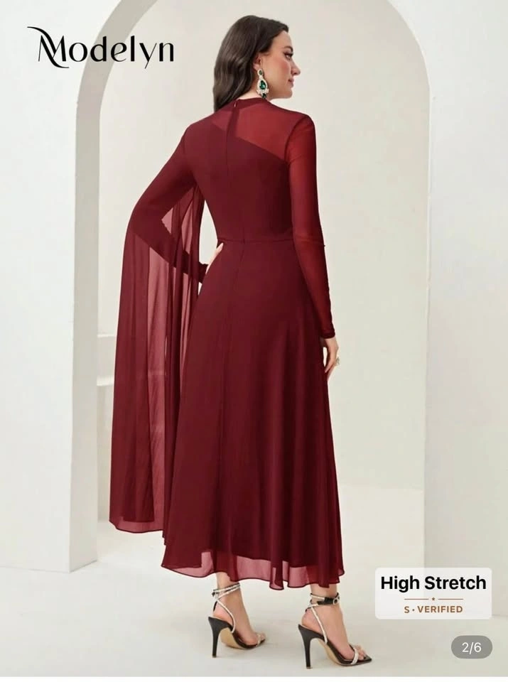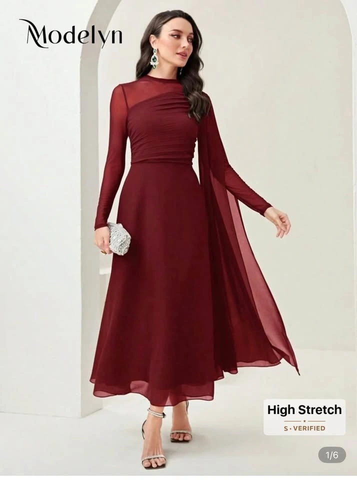 Brand new Modelyn burgundy red evening dress with contrast mesh long sleeves and ruched detailing for a flattering, body-skimming fit. Elegant full-length silhouette with soft stretch fabric that drapes beautifully. Perfect for formal events, weddings, dinners, or evening occasions. New & unworn. Ruched bodice for a flattering shape. Sheer mesh long sleeves. Rich burgundy red colour.