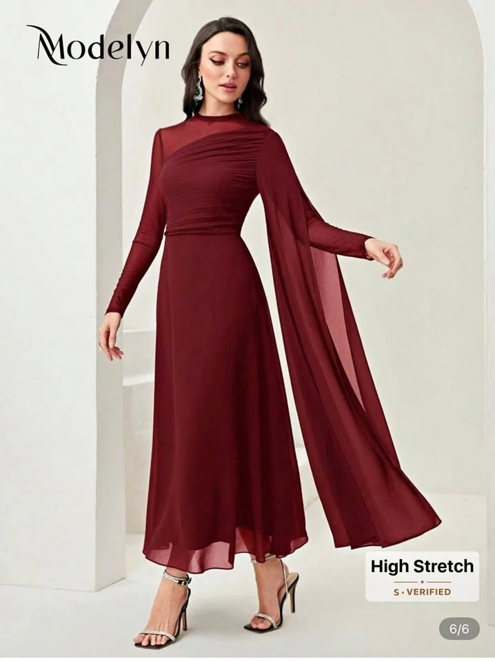 Brand new Modelyn burgundy red evening dress with contrast mesh long sleeves and ruched detailing for a flattering, body-skimming fit. Elegant full-length silhouette with soft stretch fabric that drapes beautifully. Perfect for formal events, weddings, dinners, or evening occasions. New & unworn. Ruched bodice for a flattering shape. Sheer mesh long sleeves. Rich burgundy red colour.