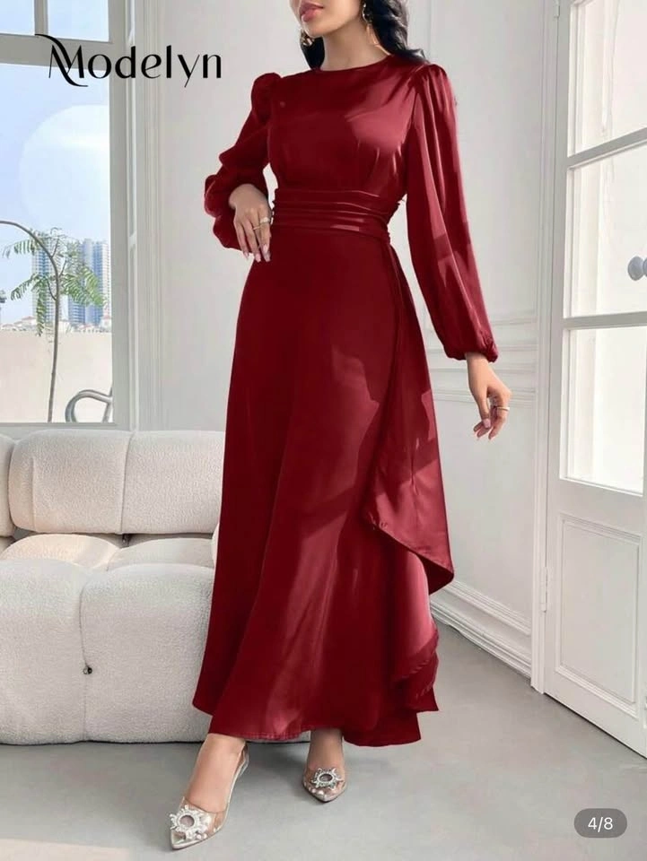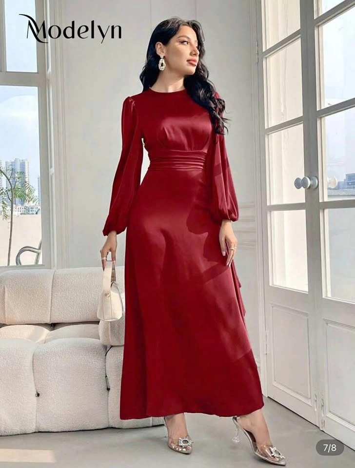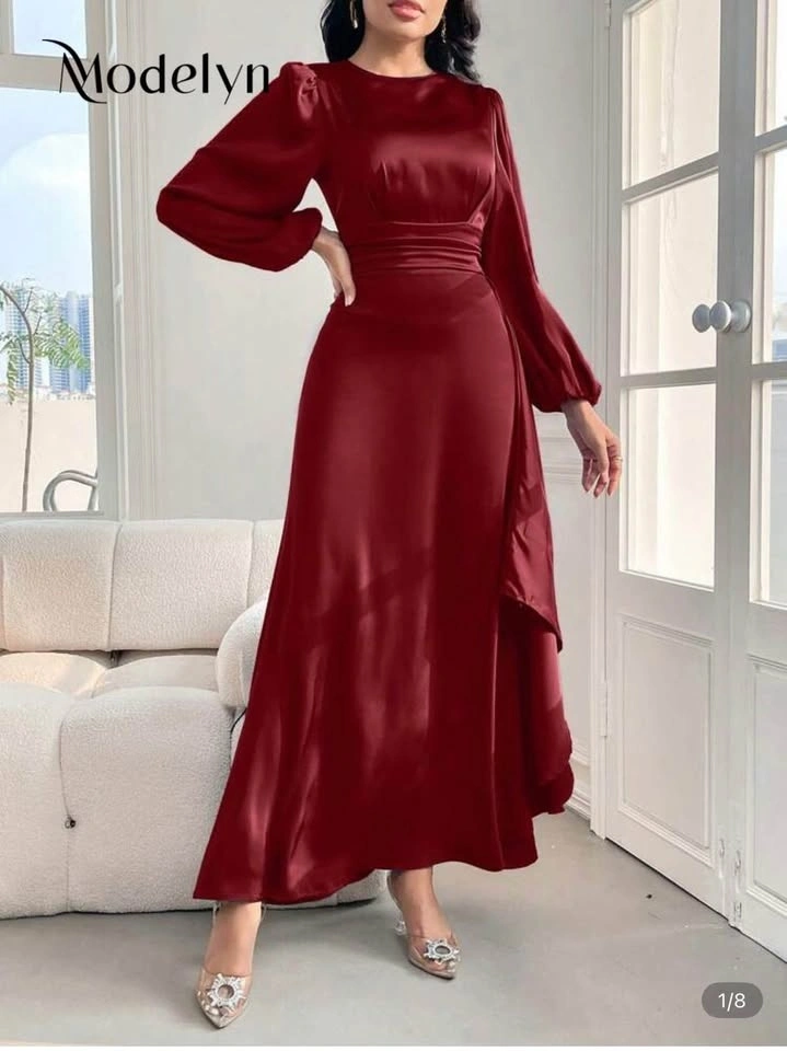 Brand new Modelyn burgundy red maxi dress with lantern sleeves and a cinched waist. Elegant A-line cut with a flowy skirt and smooth satin finish. Ideal for formal occasions, weddings, or evening wear.