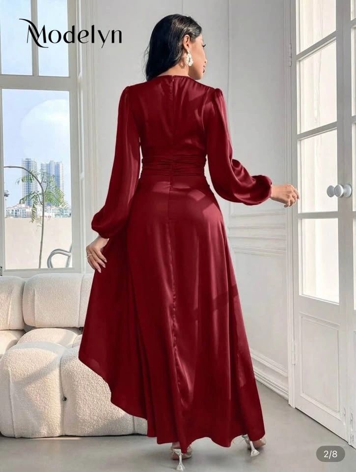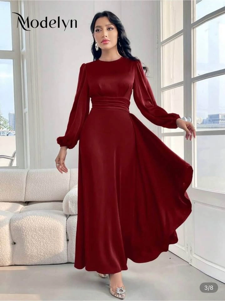 Brand new Modelyn burgundy red maxi dress with lantern sleeves and a cinched waist. Elegant A-line cut with a flowy skirt and smooth satin finish. Ideal for formal occasions, weddings, or evening wear.
