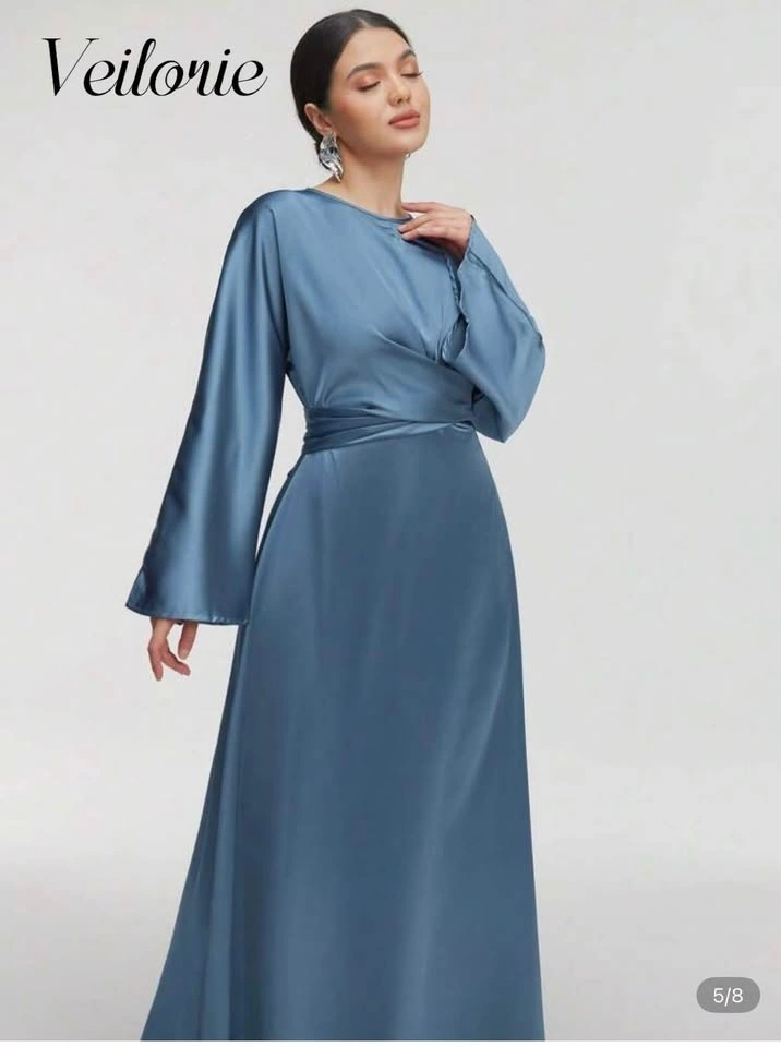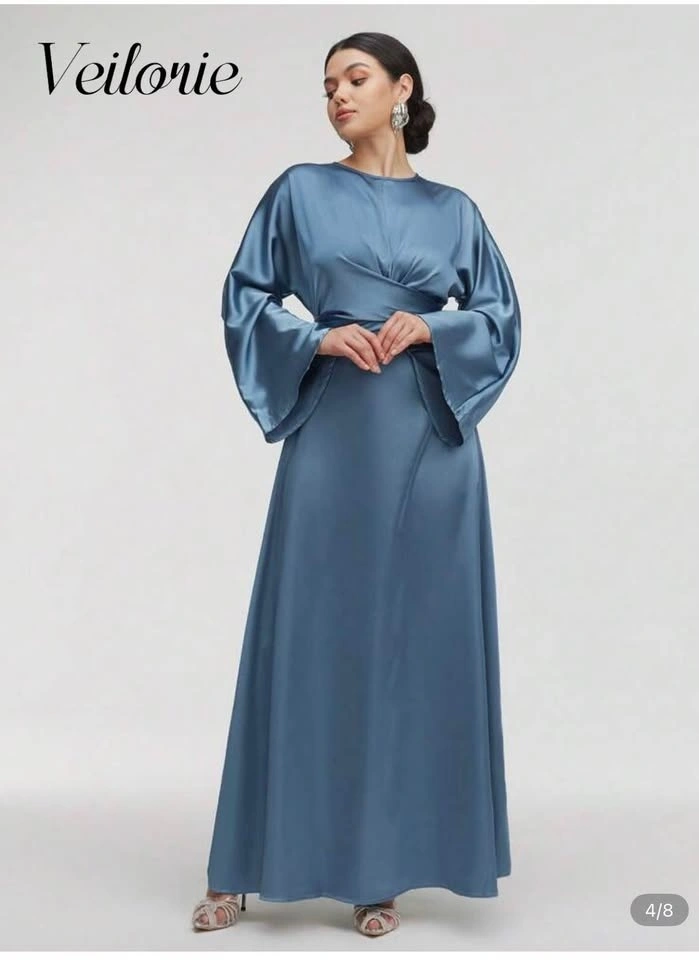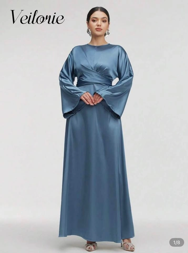 Brand new and unworn Veilorie satin maxi dress in a stunning dusty blue shade. Elegant wrap-style bodice with a cinched waist and flowy A-line skirt. Features long bell sleeves and a soft satin finish—perfect for weddings, formal events, or evening occasions.