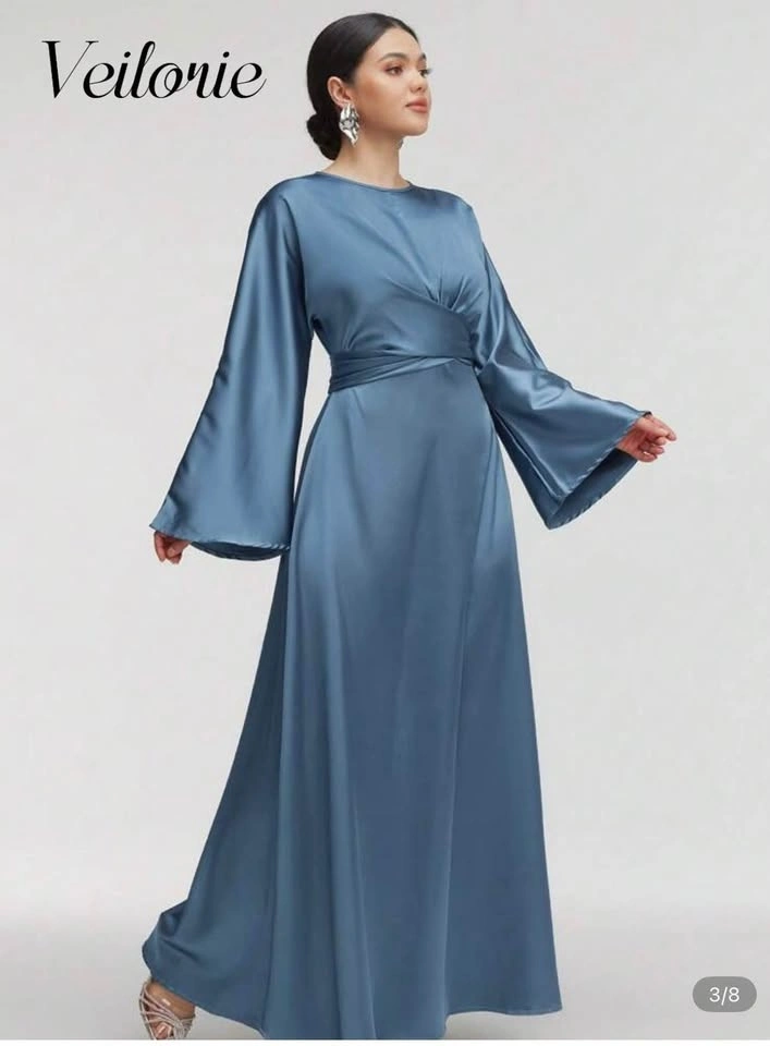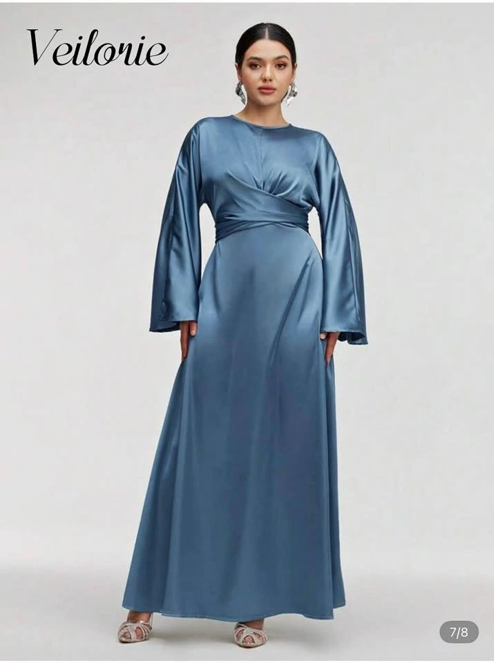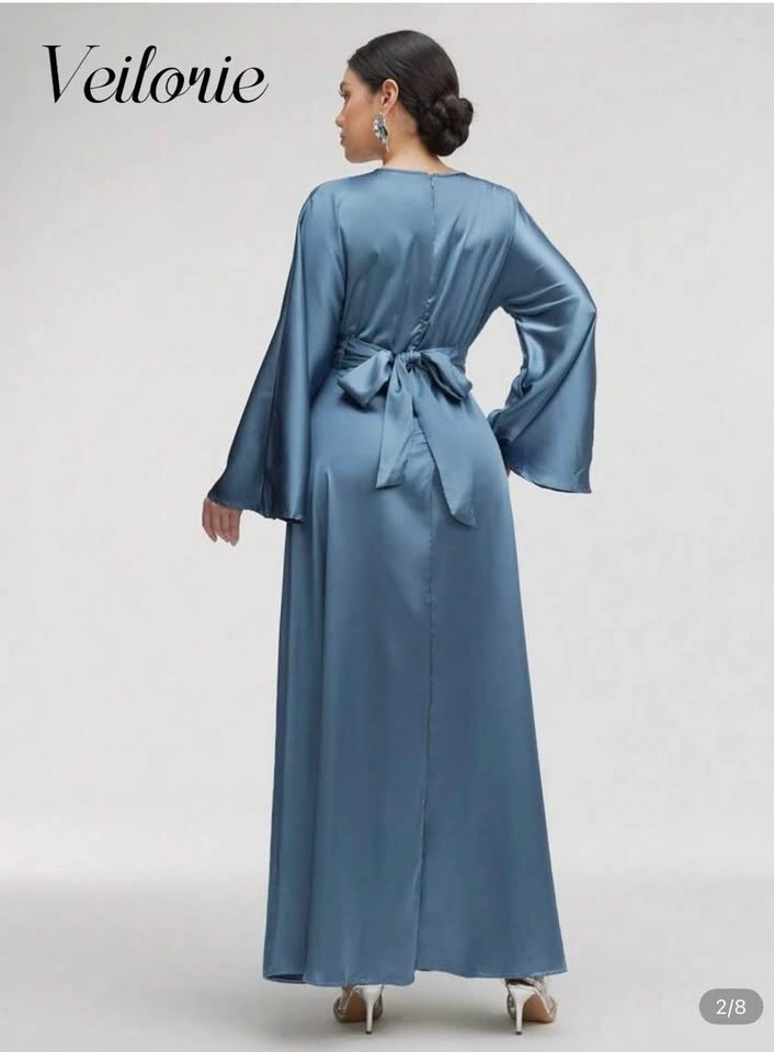 Brand new and unworn Veilorie satin maxi dress in a stunning dusty blue shade. Elegant wrap-style bodice with a cinched waist and flowy A-line skirt. Features long bell sleeves and a soft satin finish—perfect for weddings, formal events, or evening occasions.