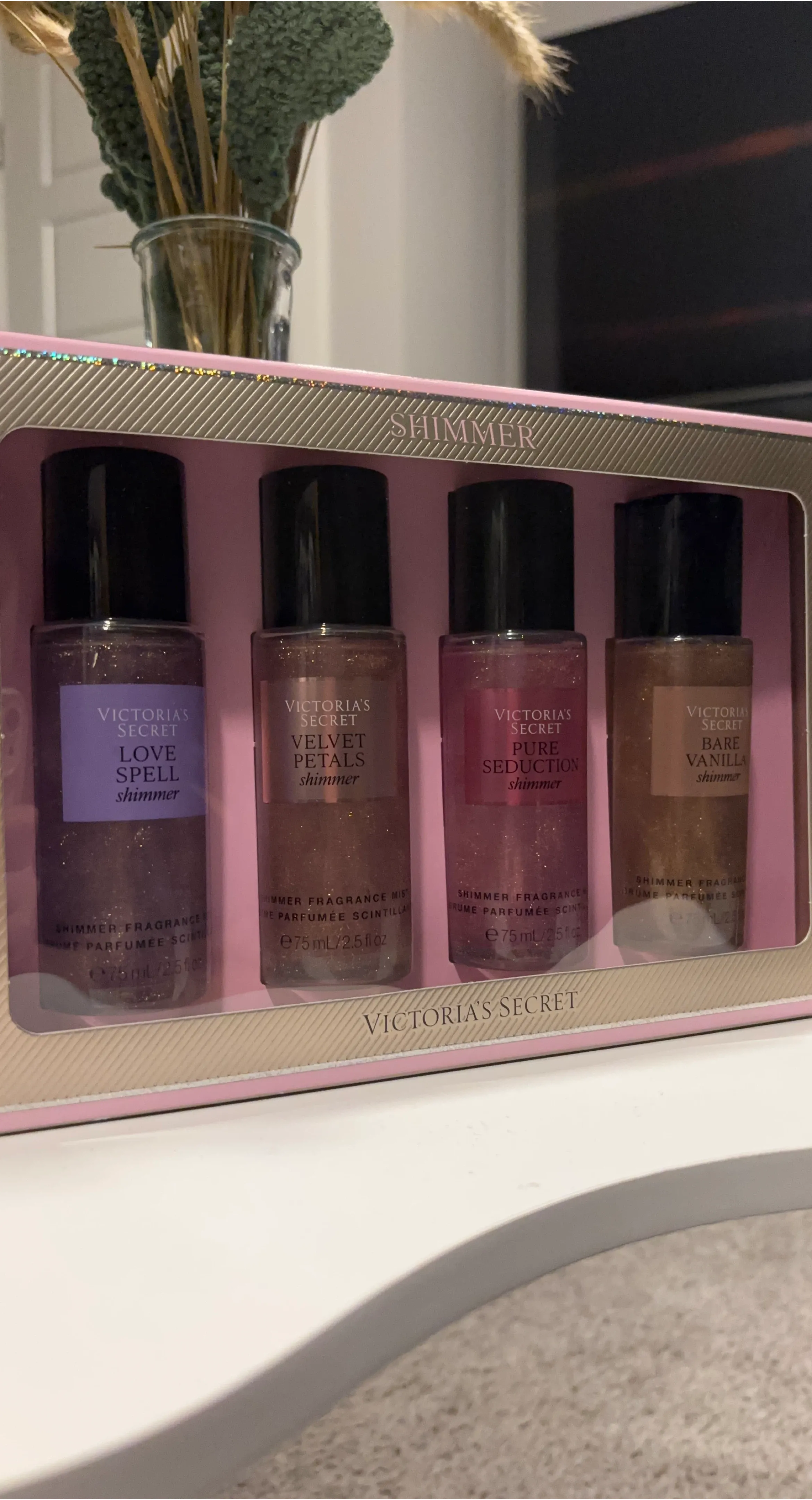 This Victoria's Secret set includes four shimmer fragrance mists: Love Spell, Velvet Petals, Pure Seduction, and Bare Vanilla. Each mist is 75ml or 2.5 fl oz. It's perfect for adding a touch of shimmer and scent!