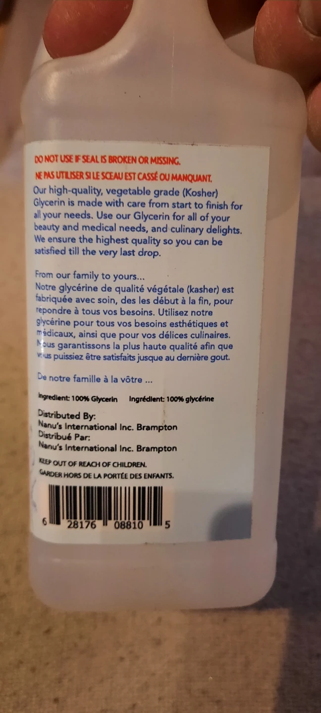High-quality vegetable grade (Kosher) Glycerin. It's made with care from start to finish for all your needs. Use it for beauty, medical, and culinary delights. 100% Glycerin.