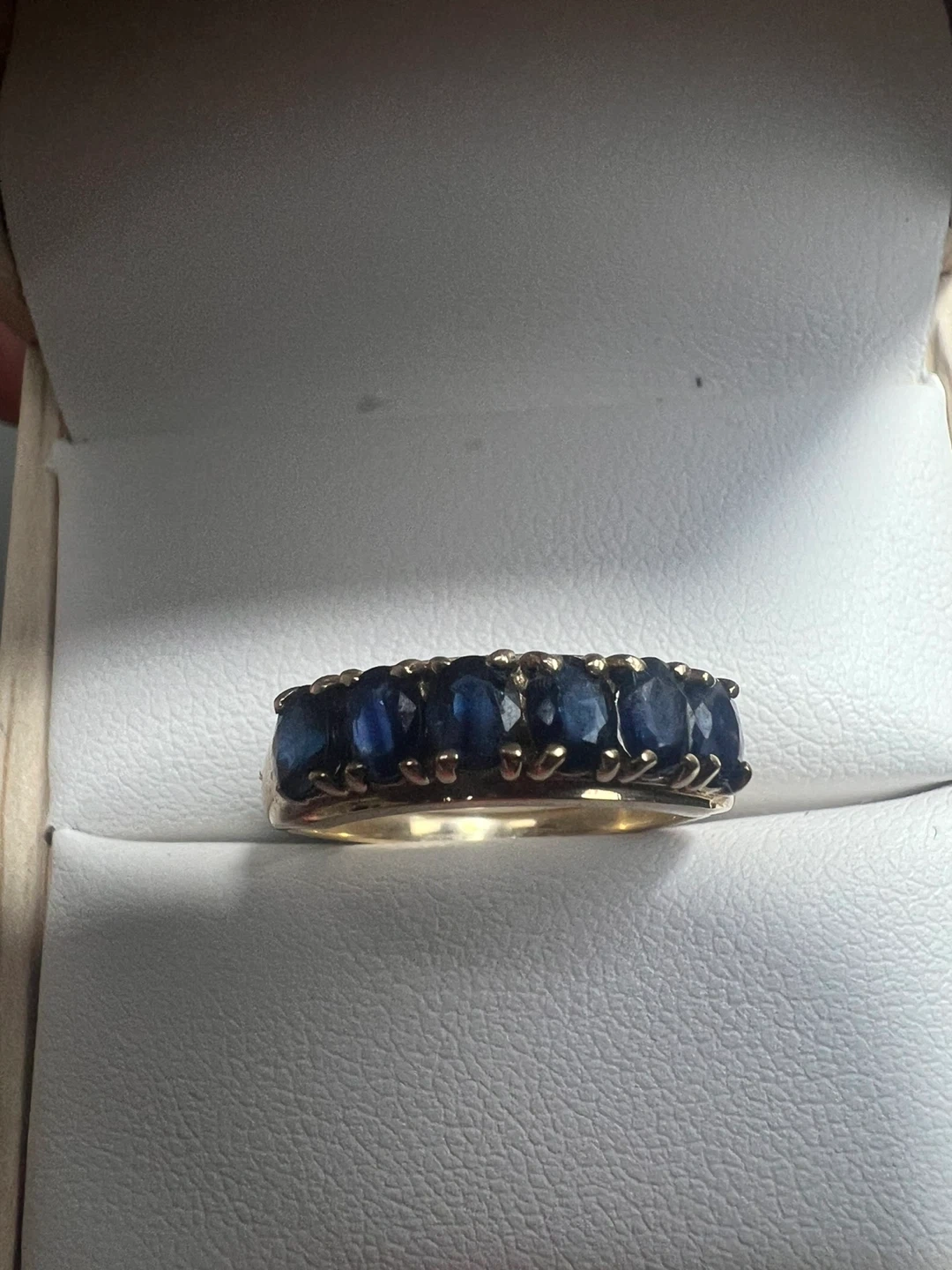Pretty ring with a row of deep blue sapphires set in 10K gold. It's a timeless design that adds a touch of elegance. This band would make a lovely addition to any jewelry collection!