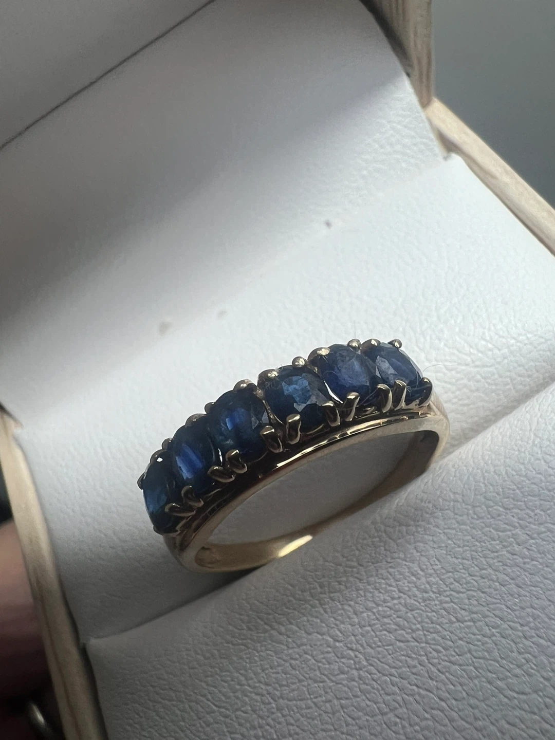 Pretty ring with a row of deep blue sapphires set in 10K gold. It's a timeless design that adds a touch of elegance. This band would make a lovely addition to any jewelry collection!