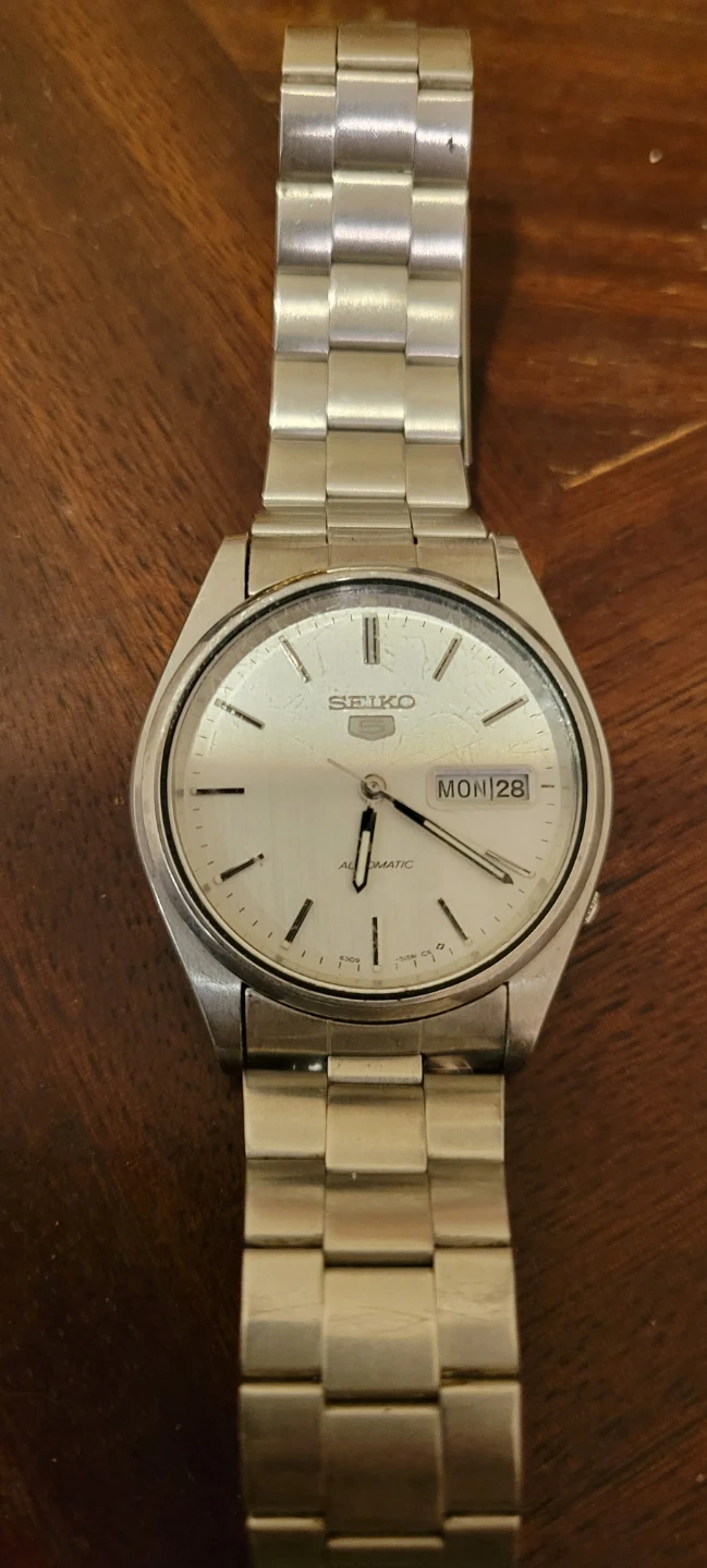 This Seiko 5 watch features a stainless steel band and case. It's an automatic movement with a day and date display. The watch has a silver dial.