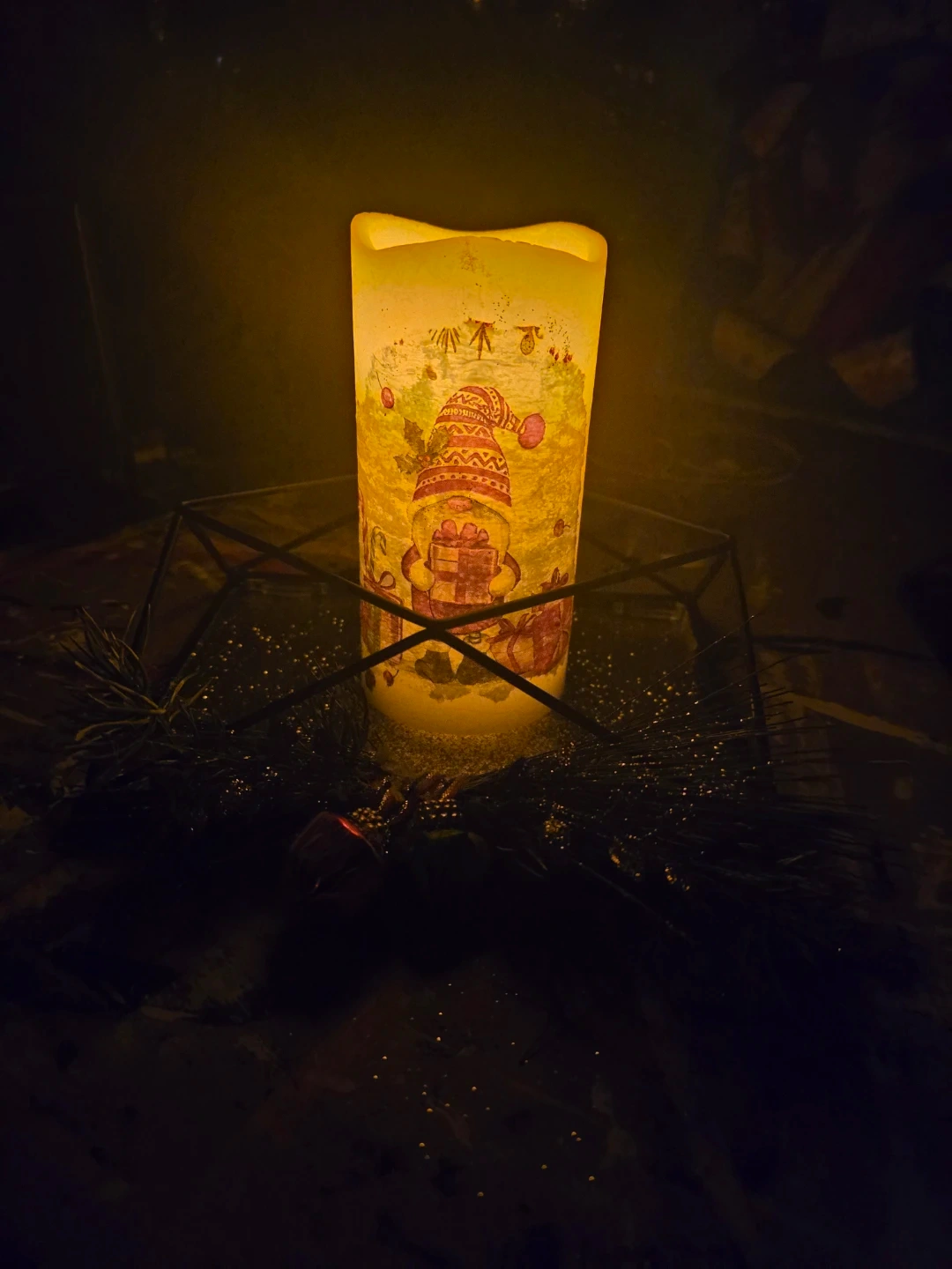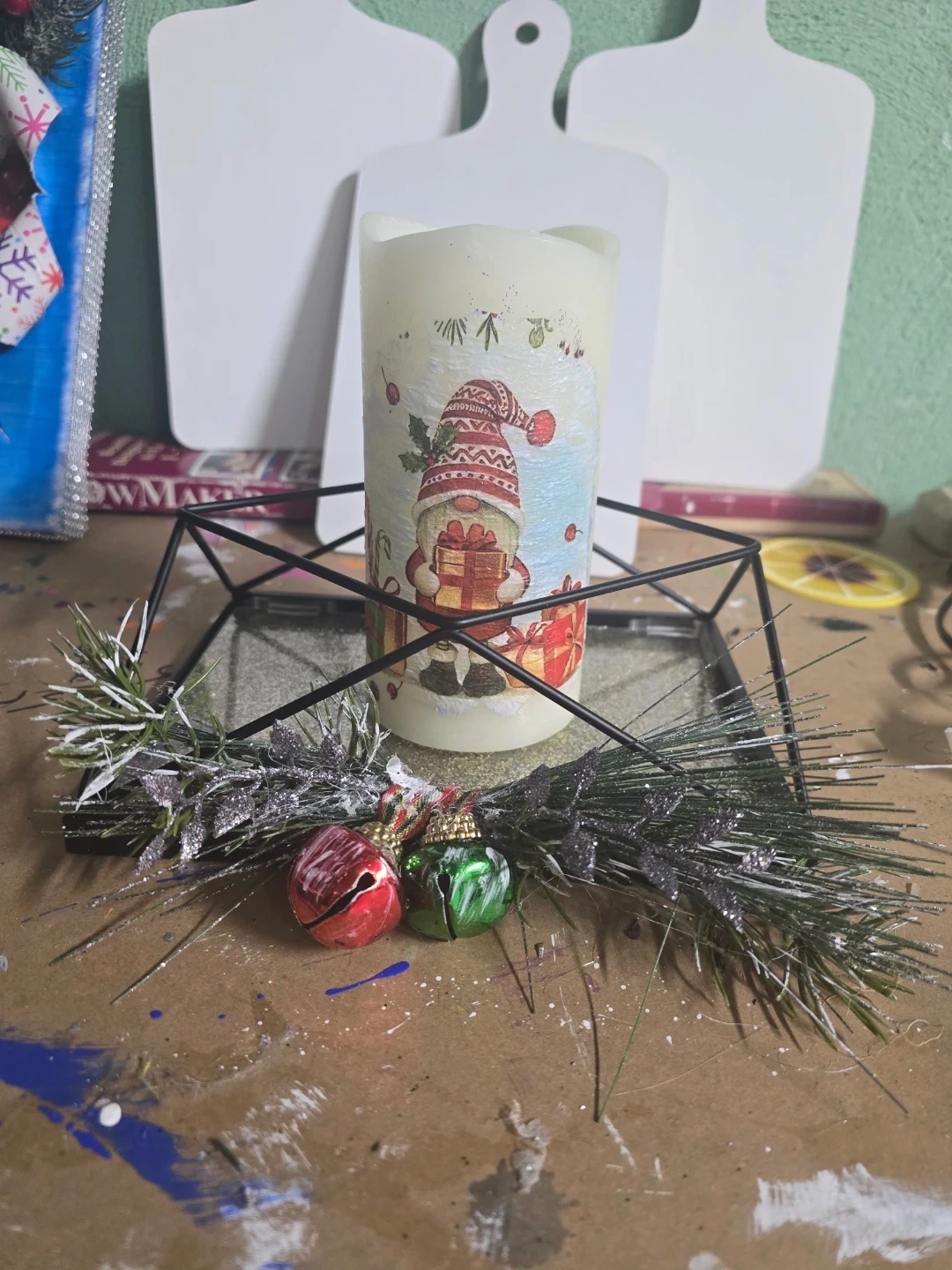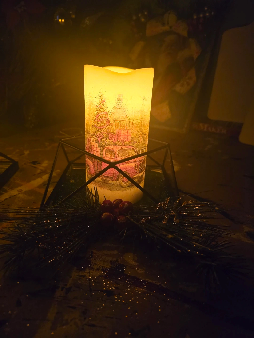 This flameless LED candle features charming Christmas designs, including gnomes and vintage trucks with festive scenes. It's housed in a geometric metal holder decorated with faux pine and jingle bells, creating a cozy holiday ambiance. Perfect for adding a touch of seasonal cheer to your home decor without any fire hazard!