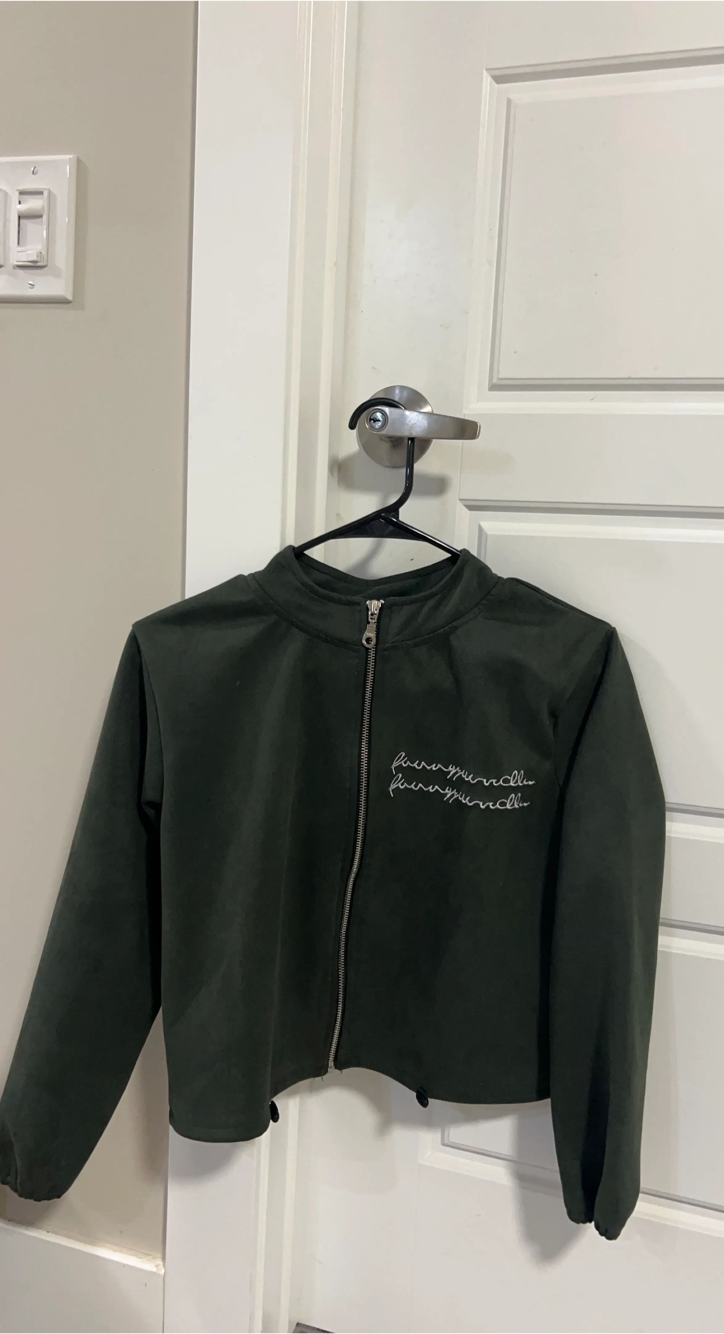 This dark green bomber jacket features a stylish embroidered design on the chest. It's made from a soft material and has a full zip closure. The jacket has a relaxed fit and elastic cuffs. Who might find this useful? Someone looking for a casual, stylish outerwear piece for cooler weather!
