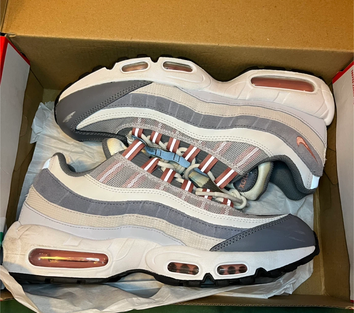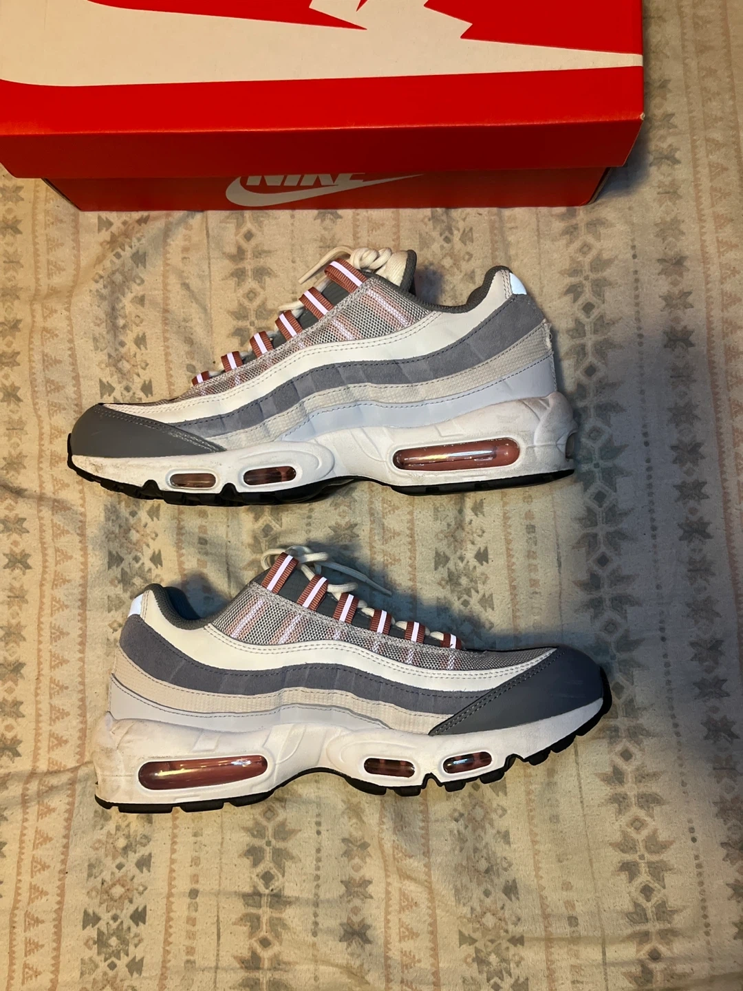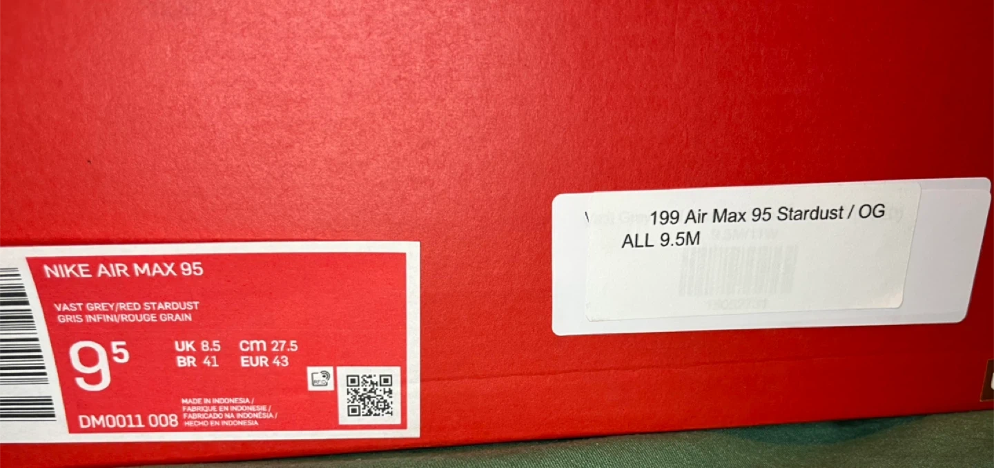 Nike Air Max 95 Stardust OG in Vast Grey/Red Stardust. Size 9.5 men's. These sneakers feature the iconic Air Max cushioning. Includes original box. Small scuffs on right foot shoe // offers may be accepted