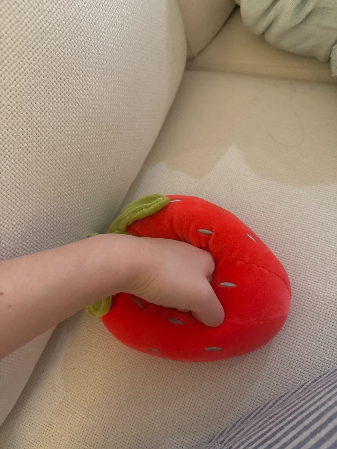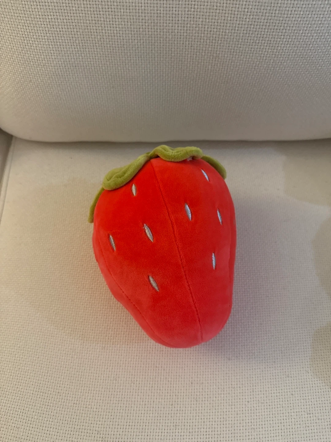 This is a soft, plush strawberry toy. It's perfect for cuddles or as a cute room decoration. Made with soft, fuzzy material.