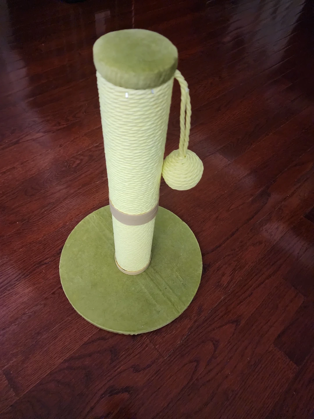 This is a light green cat scratching post with a green velvet top and base. It features a sisal rope-wrapped post for scratching and a dangling toy ball. It's a good size for many cats! Height is 17 in.