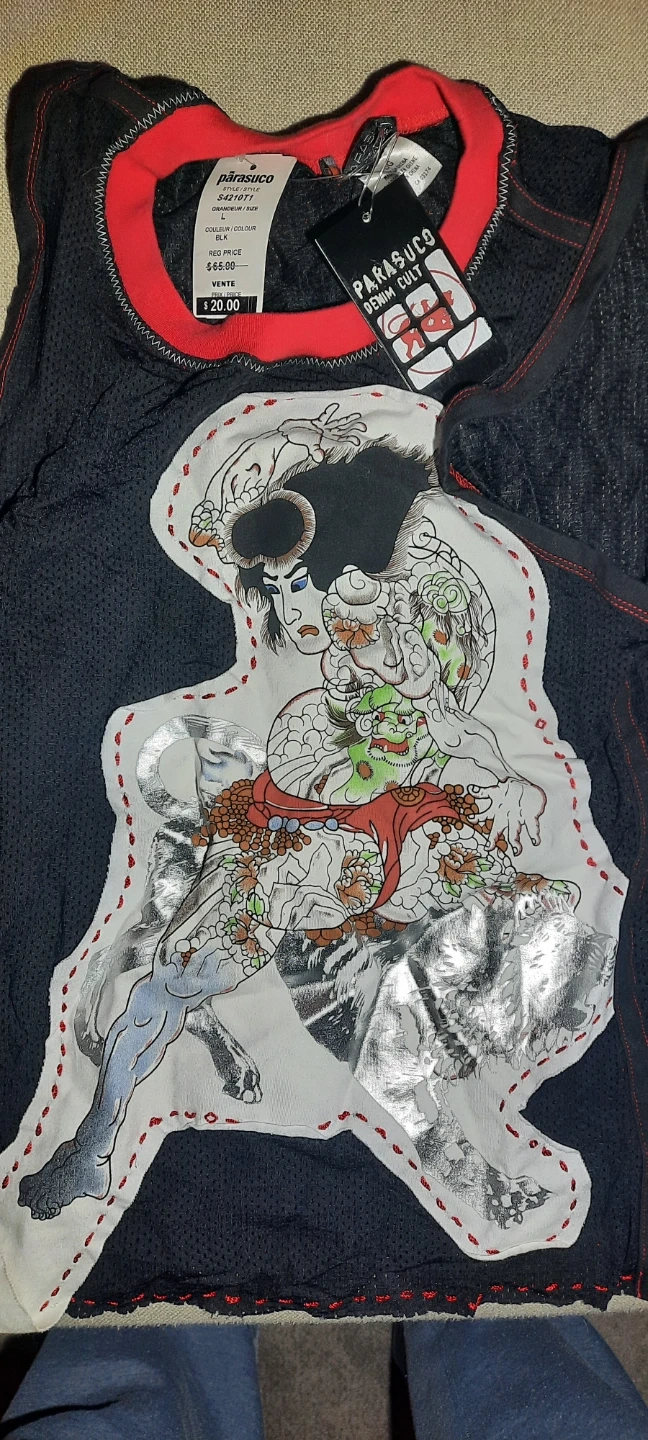 This Parasuco sleeveless shirt features a graphic print on the front. It's a size large with a black base colour and red trim. Shirt material is a blend.
