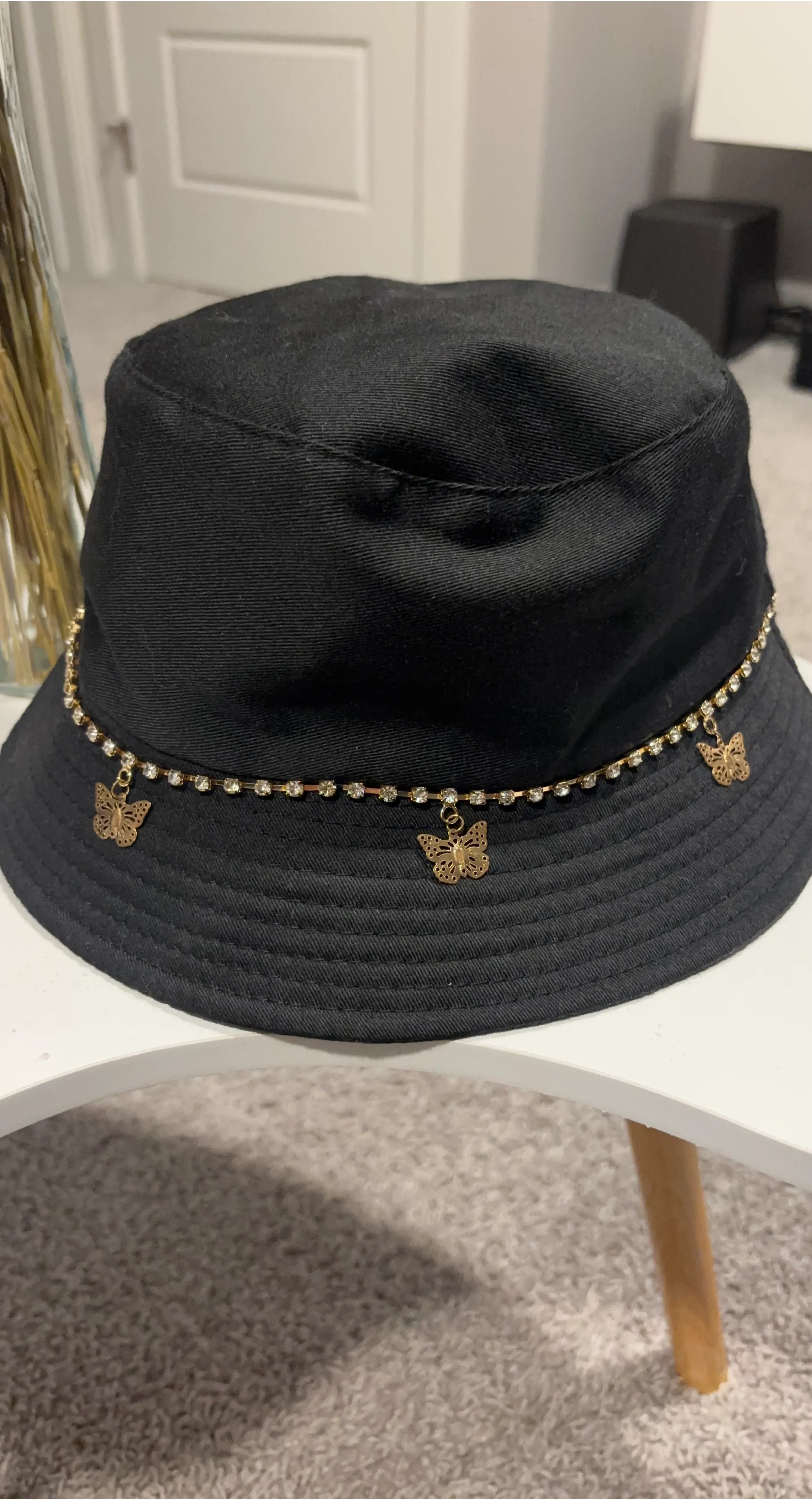 This black bucket hat features a decorative chain with rhinestones and gold butterfly charms. It's made of durable fabric and offers a stylish look. It's a fun accessory for any outfit!