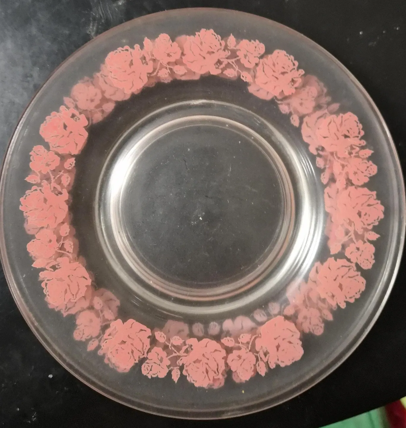 This is a clear glass plate with a decorative pink floral pattern around the rim. It's a lovely accent piece for any table setting. The plate measures approximately 7 inches in diameter.