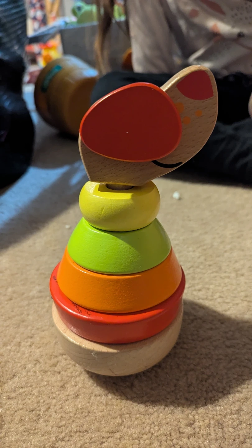 This is a colourful wooden stacking toy. It's made of wood with painted rings. This toy is great for developing fine motor skills.