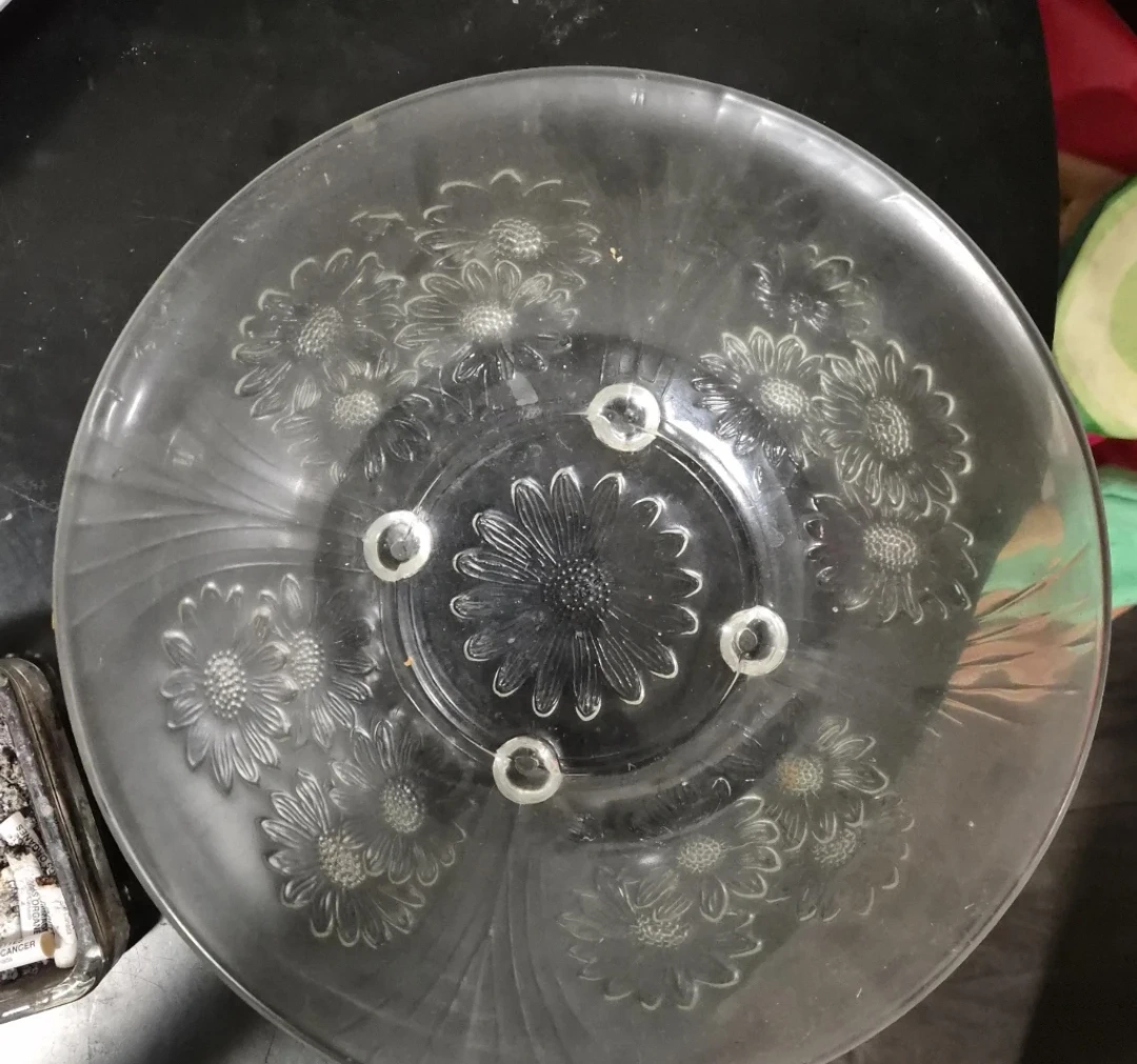 This is a clear glass serving platter with a daisy embossed design. It's a nice size for snacks or small dishes. Perfect for serving at gatherings!