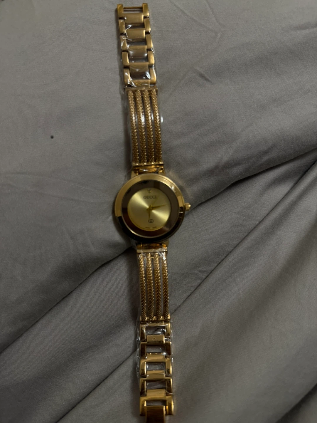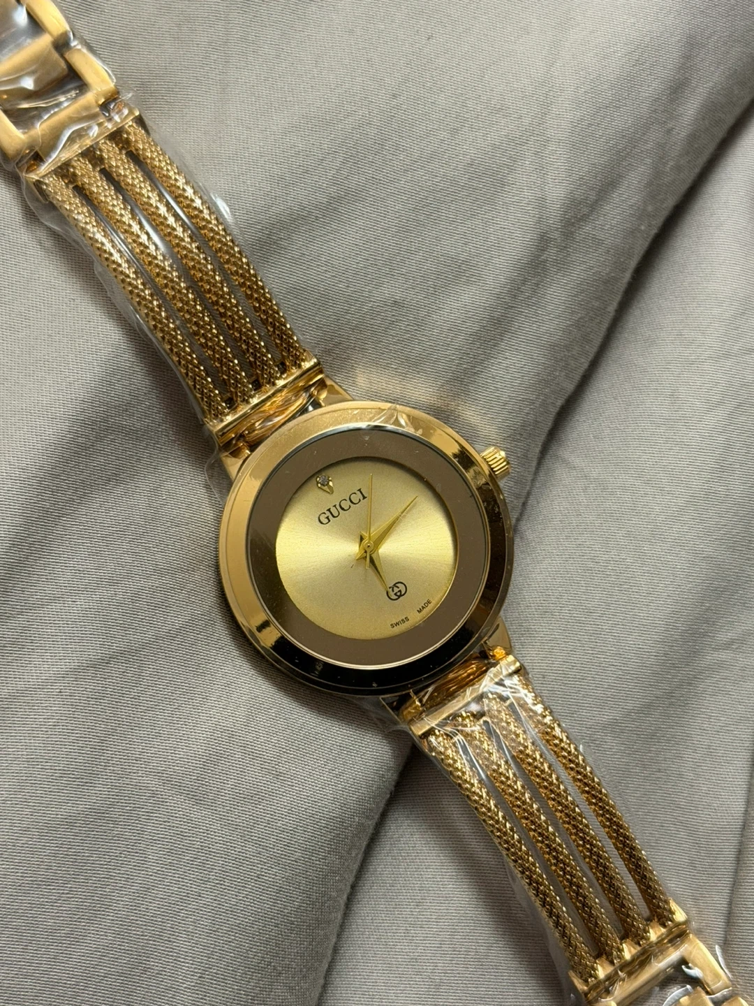 This is a gold tone Gucci watch made in Switzerland. It features a classic analog display and a stylish multi-strand bracelet. It's a beautiful accessory for any occasion!