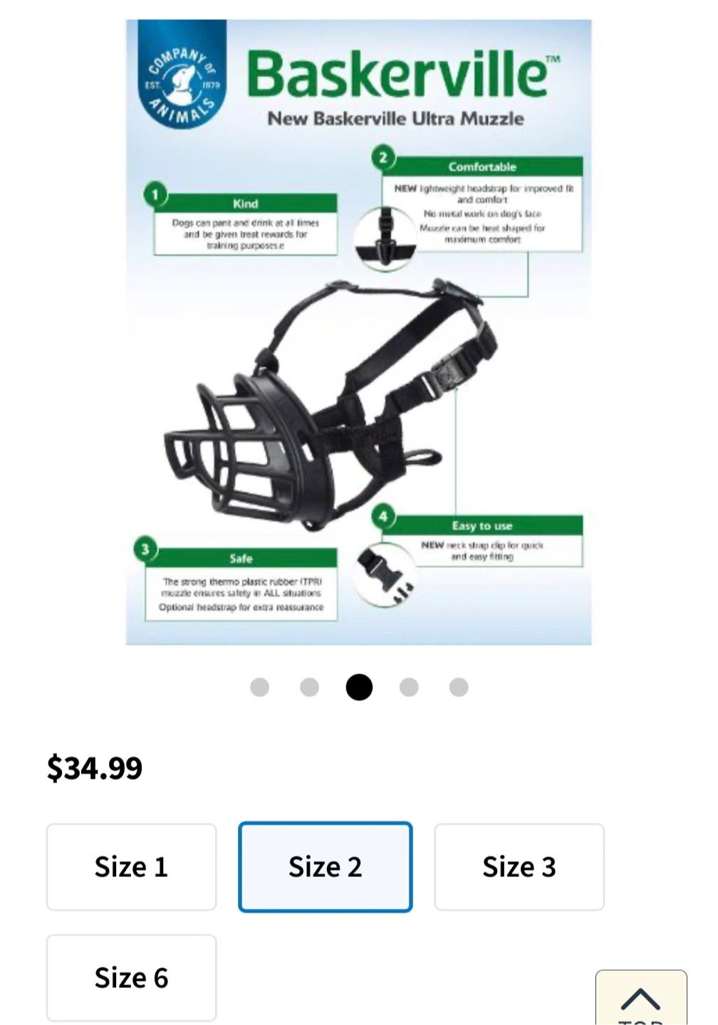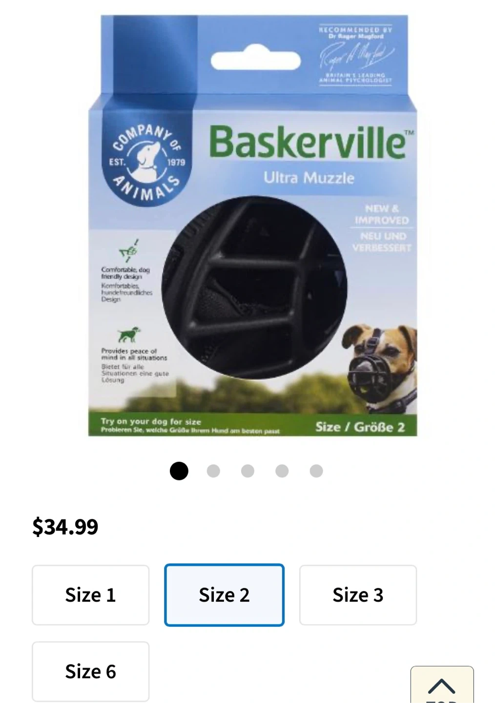This is a Baskerville Ultra Muzzle in Size 2. It's designed for dog comfort with a lightweight headstrap and a secure fit. Dogs can still pant and drink at times while wearing it.