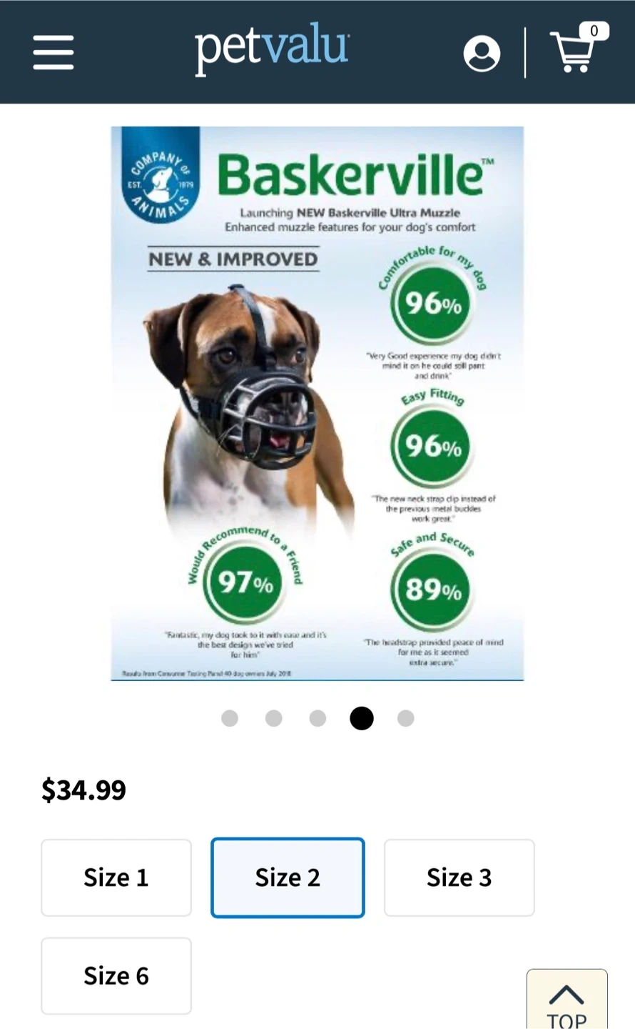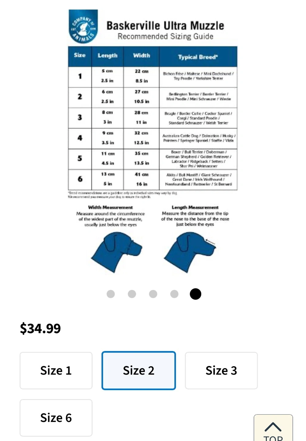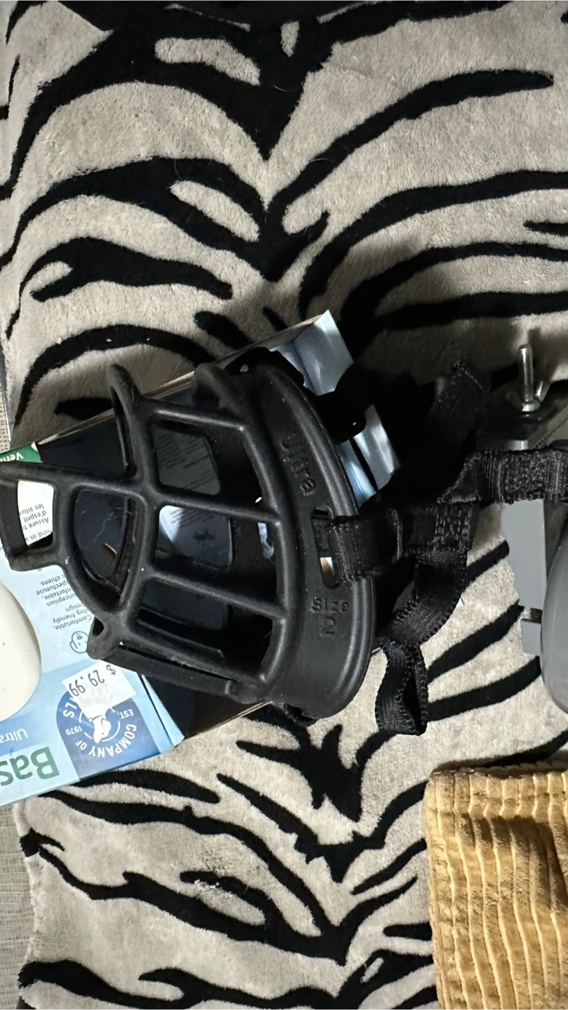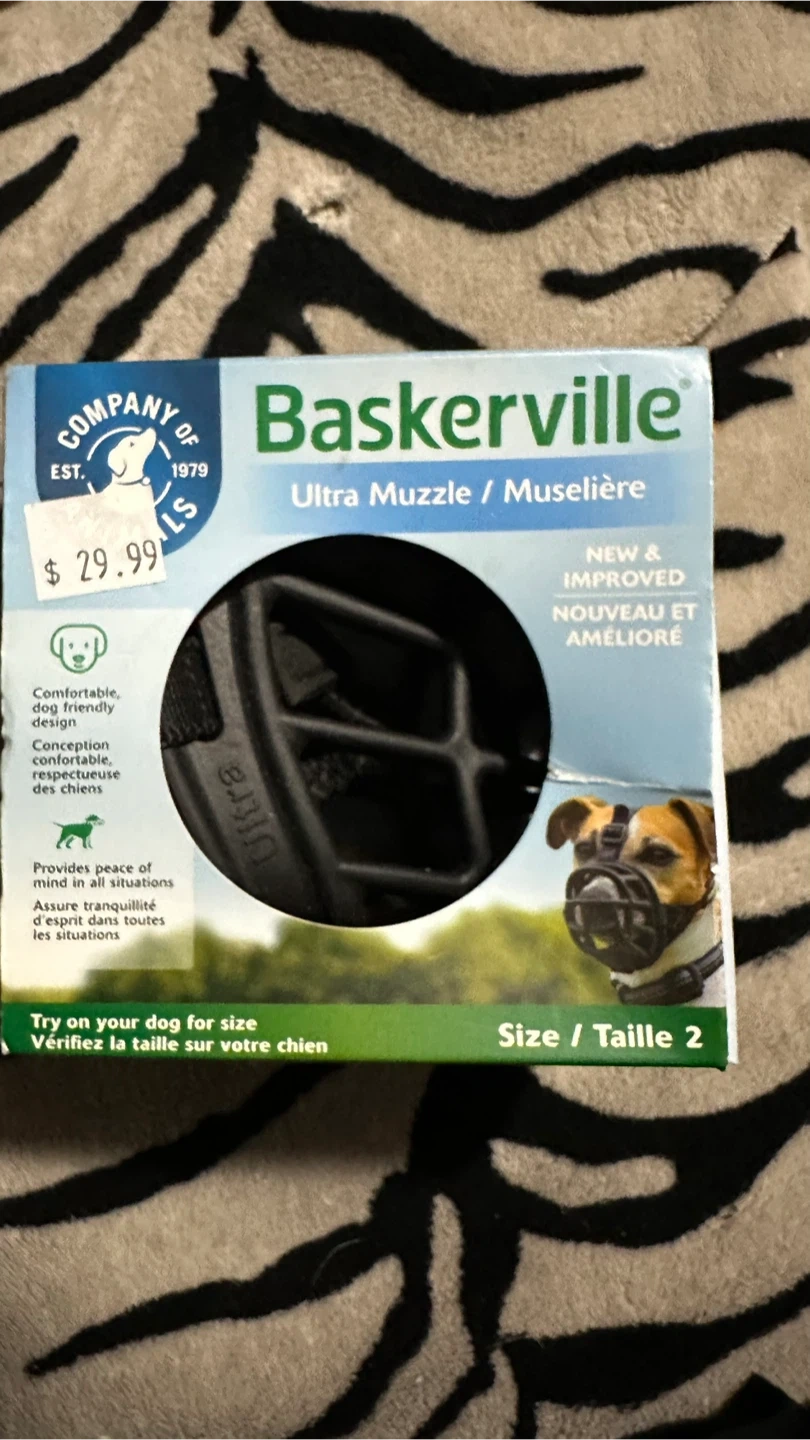 This is a Baskerville Ultra Muzzle in Size 2. It's designed for dog comfort with a lightweight headstrap and a secure fit. Dogs can still pant and drink at times while wearing it.