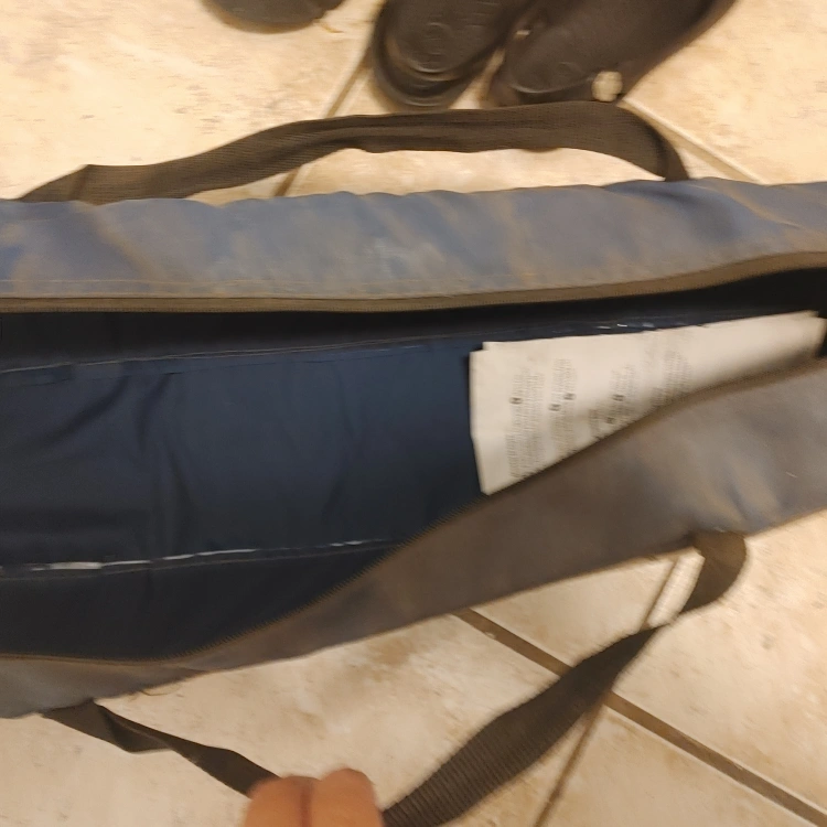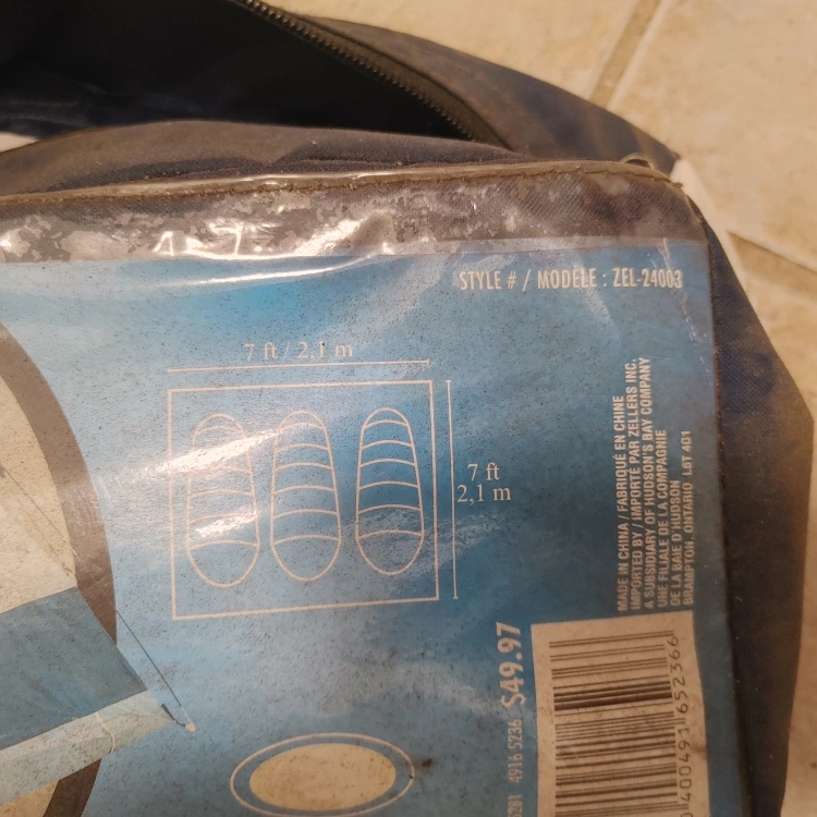 Dome tent in blue and beige. Includes tent, poles, and carrying bag. Compact for easy transport. Great for camping trips!