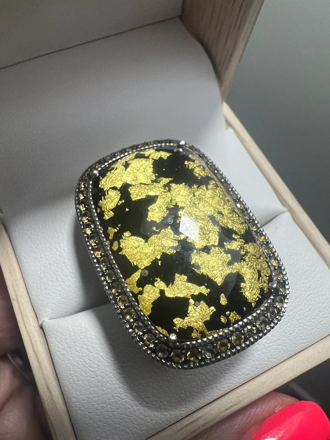 This eye-catching statement ring features a striking black inlay with gold leaf accents. It's bordered by small citrines . The band is stamped "SIRIP 925".