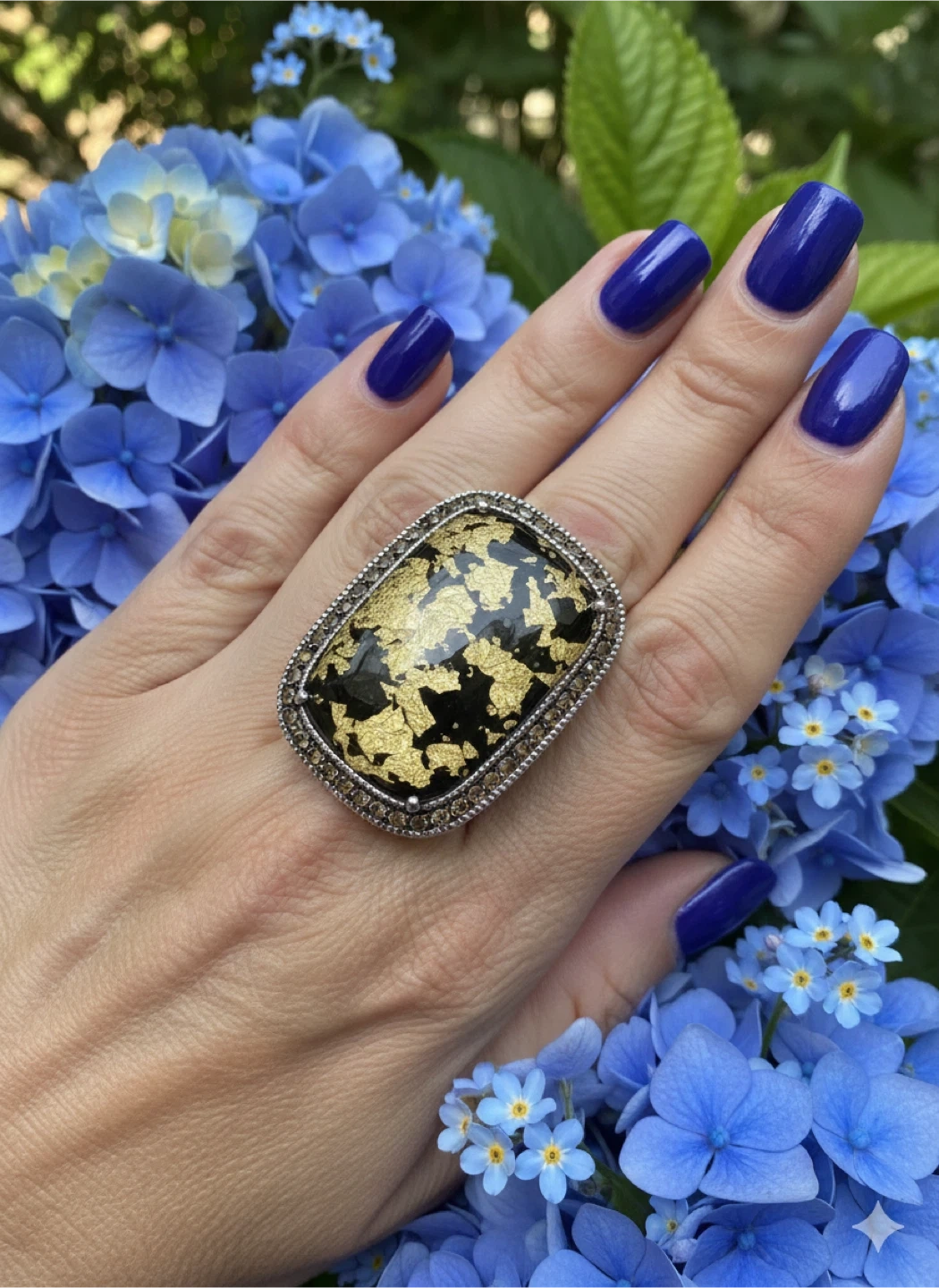 This eye-catching statement ring features a striking black inlay with gold leaf accents. It's bordered by small citrines . The band is stamped "SIRIP 925".