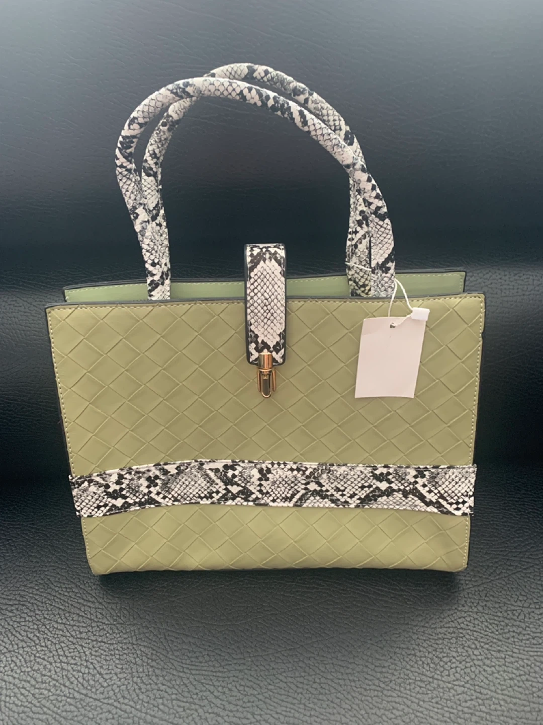 This stylish handbag features a woven olive green exterior with contrasting snake print accents on the handles and strap. It has a secure clasp closure and a zippered main compartment. The textured design makes it a versatile accessory.