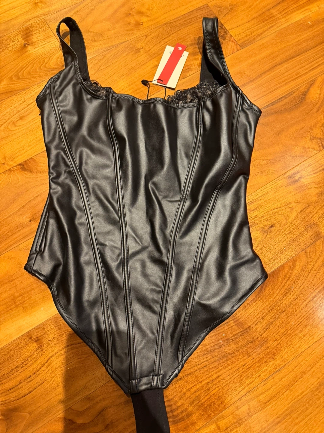 Brand New Never Worn Popilush bodysuit in a faux leather finish. Features delicate lace trim along the neckline and adjustable straps. It's designed with a flattering corset-style front. This piece adds a stylish touch to any outfit!