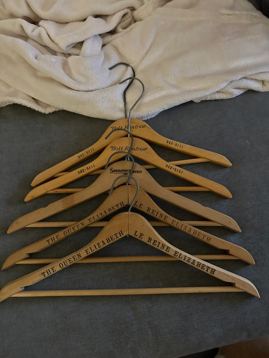 Selling a set of 5 vintage wooden hangers. Two are branded Holt Renfrew with phone numbers. Three are from The Queen Elizabeth (Le Reine Elizabeth) now a hotel in Dubai. They're great for organizing closets. Made of wood.