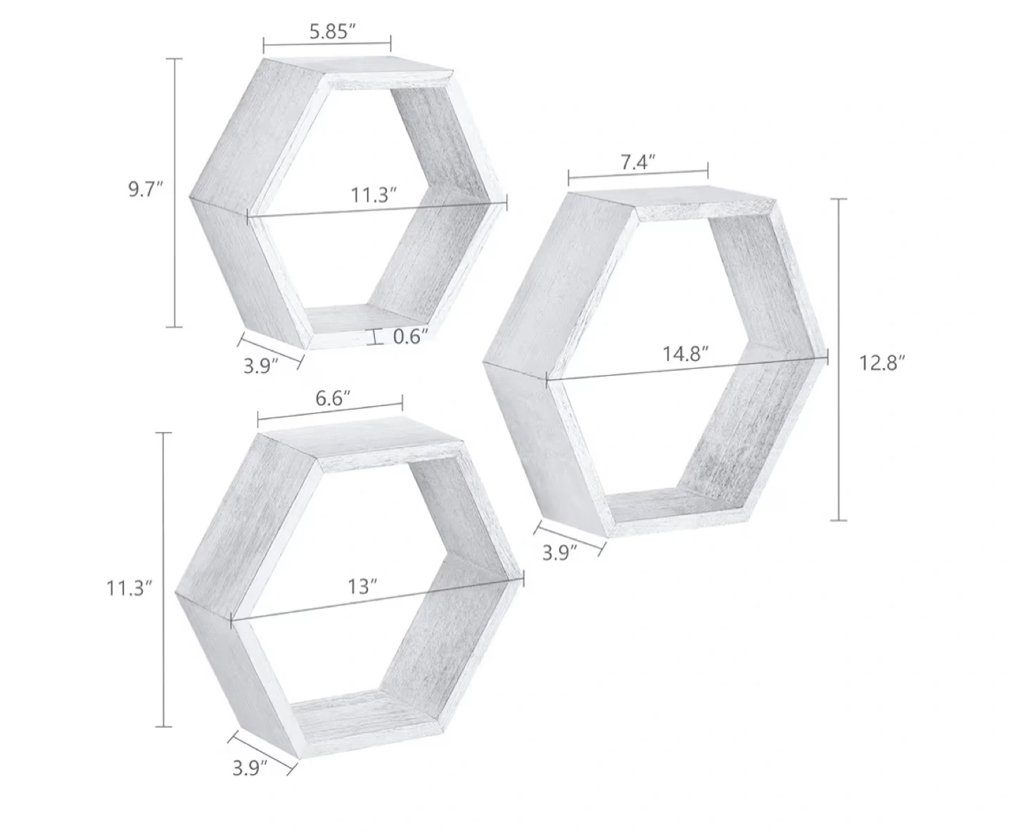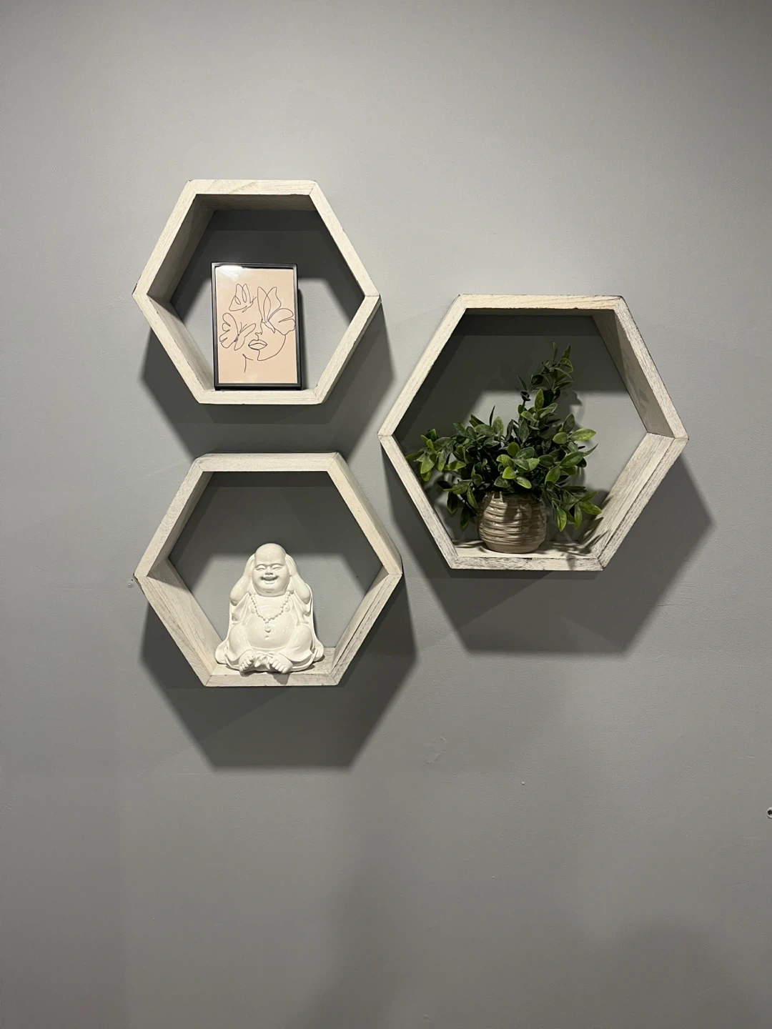 Buy & SellSet of 3 White Hexagon ShelvesSet of 3 White Hexagon Shelves$25This is a set of three white hexagon-shaped shelves with a distressed wood finish. They're great for displaying small decor items.WHERE TO MEETCheck LocationView MapSELLERverifiedHollyHenry Farm943 reviews1 chats·1 favorites·16 viewsSEND CHAT TO SELLERHi Holly! I’m interested in your listing.Hi Holly! I’m interested in your listing.Get the Karrot app to chatSign In to chat