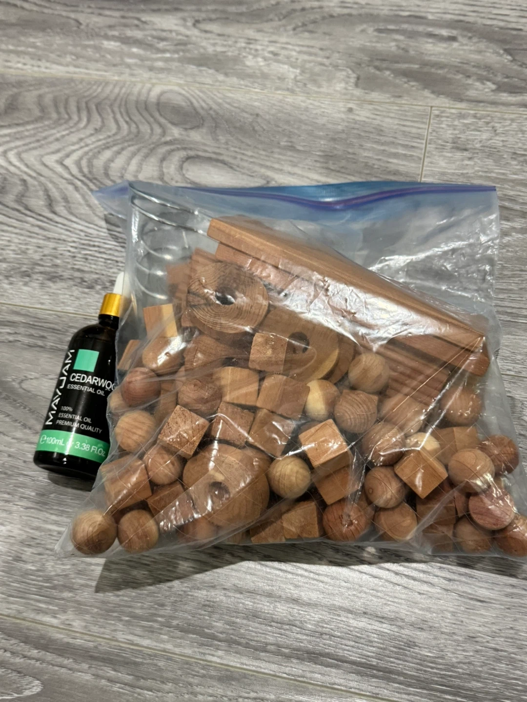 Approximately 2/3 of a 100ml bottle of MAYJAM Cedarwood Essential Oil and a bag of cedarwood pieces. The cedarwood pieces are a natural way to freshen closets and drawers. They're great for repelling moths and absorbing moisture.